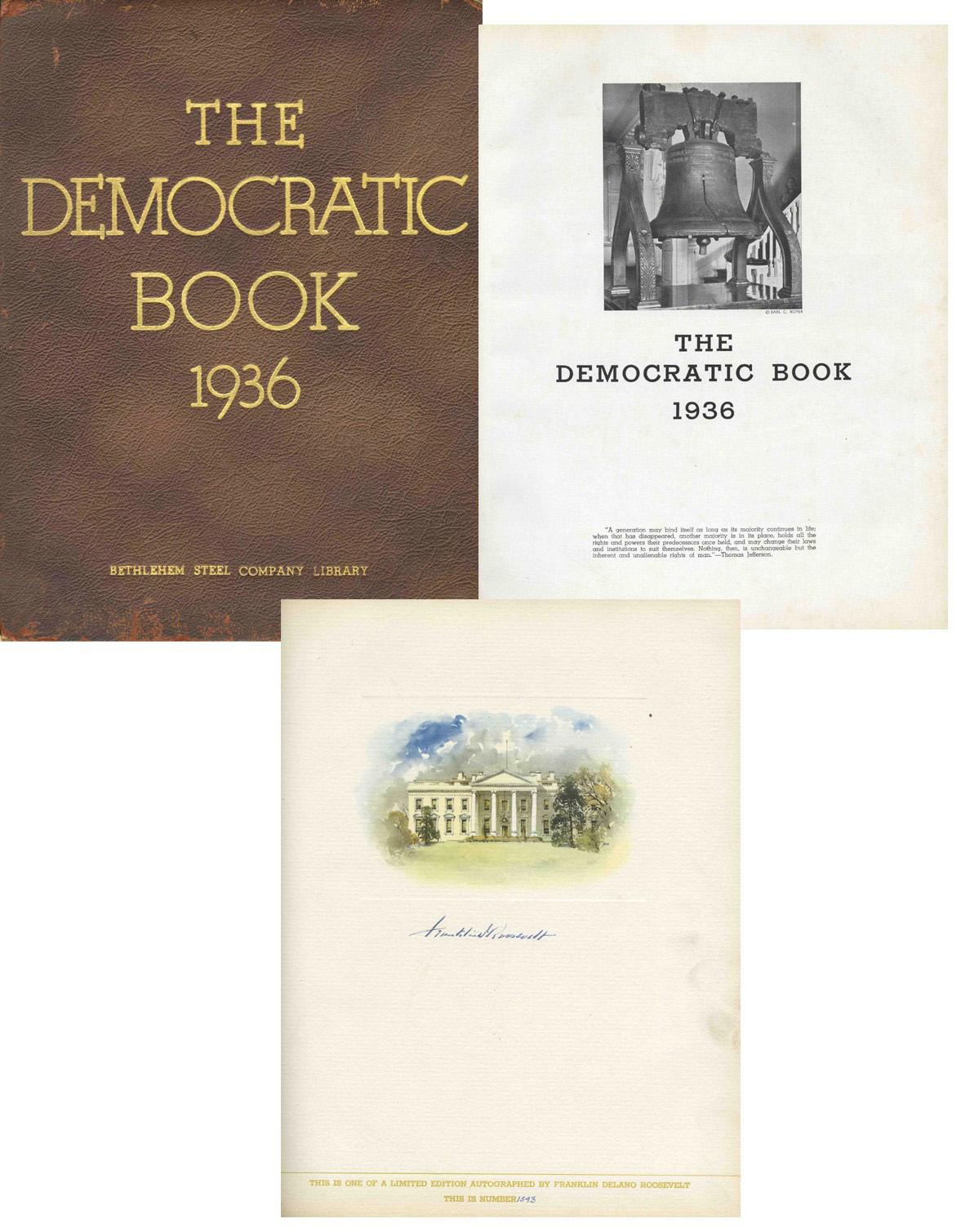 Franklin D. Roosevelt signed copy of ''The Democratic Book 1936.'' Copy #433 of a limited edition run. Stunning bold ink ''Franklin D. Roosevelt'' signature beneath watercolor image of the White House; scarce as such, since previous owners removed these signed portraits from the books. First edition 384pp. volume in original gilded leather boards measures 11.5'' x 14.5'' and is profusely illustrated. Paper loss to FDR portrait on page 12 and slight wear to board edges and ends. Overall, very good condition.
