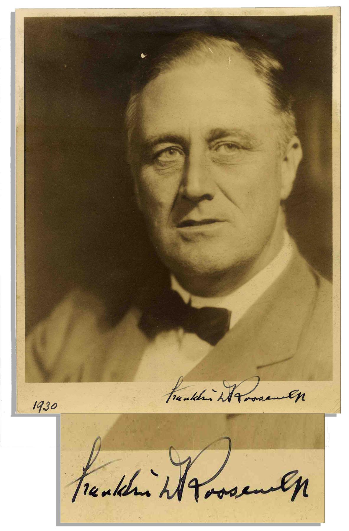 Nice Franklin D. Roosevelt 1930 signed photo as Governor of New York. Matte photo measures 7.5'' x 9.5'', signed boldly ''Franklin D. Roosevelt'' and dated ''1930'' along the bottom margin. Photo has minor wear to edges and a tiny white fleck above Roosevelt's head, else near fine condition.