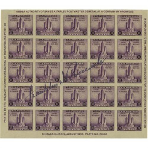 <B>Franklin D. Roosevelt 1933 3¢ Souvenir Stamp Sheet Signed.</B></I> A mint block of 25 3¢ Century of Progress (Scott #731) printed as a souvenir of the American Philatelic Society's convention at the Chicago Century of Progress Exposition. Roosevelt's neatly penned ink signature is 3.5" long, diagonally across the stamps. Signed as president, a great association piece as Roosevelt was a serious philatelist. Excellent condition.<BR><BR><b>Shipping:</b> Flat Material, Small (<a target="_blank" href="http://www.heritageauctions.com/common/shipping.php">view shipping information</a>)