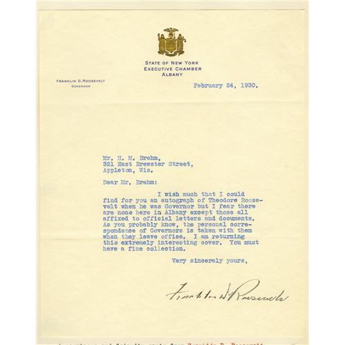 <B>FDR Typed Letter Signed,</B></I> "<I>Franklin D Roosevelt</B></I>", one page on New York Governor's letterhead, 7.25" x 9", Albany, New York, February 24, 1930, to Mr. H. M. Brehm, Appleton, Wisconsin. Responding to a request, the future president genially writes: "I wish much that I could find for you an autograph of Theodore Roosevelt when he was Governor but I fear there are none here in Albany except those all affixed to official letters and documents. As you probably know, the personal correspondence of Governors is taken with them when they leave office. I am returning this extremely interesting cover. You must have a fine collection." Typically nice, large FDR signature. Very fine condition.<BR><BR><b>Shipping:</b> Flat Material, Small (<a target="_blank" href="http://www.heritageauctions.com/common/shipping.php">view shipping information</a>) <BR><BR><B>Important no