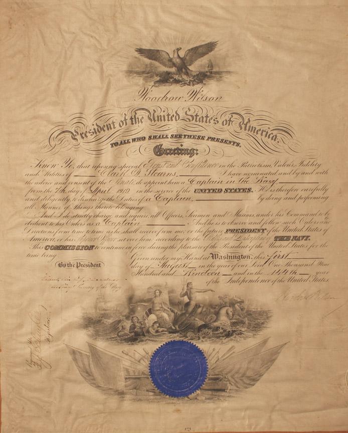Large document signed by President Woodrow Wilson and Secretary of the Navy Franklin D. Roosevelt, dated 1 August 1919. Flanking the document are the signatures “Woodrow Wilson” and “Franklin D. Roosevelt” in brown ink. The document measures 15.5'' x 19.5'' and contains a large blue United States of America Naval Seal at bottom; it appoints Clark D. Stearns as Captain in the Navy. Light creasing and chipping at the perimeter, and somewhat faded signatures. Overall in very good condition.