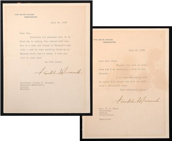 FDR Writes Joe Kennedy 6 Weeks Before the Start of WWII (1882-1945) 32nd President of the United States (1933-1945). Two related typed letters signed as President, both on The White House letterhead, 1 page each, 8¾ x 6¾", Washington, July 20, 1939. Just six weeks before the outbreak of World War II, President Roosevelt writes a letter to a close friend of his and Eleanor's and encloses a letter for her to present to Joseph Kennedy, the American ambassador in London. To Mrs. W.H. Good of Darien, Connecticut, he writes: "Eleanor has sent me your note and I am enclosing a note to Joe Kennedy. I do hope everything will be quiet this summer and that you will have a delightful trip."