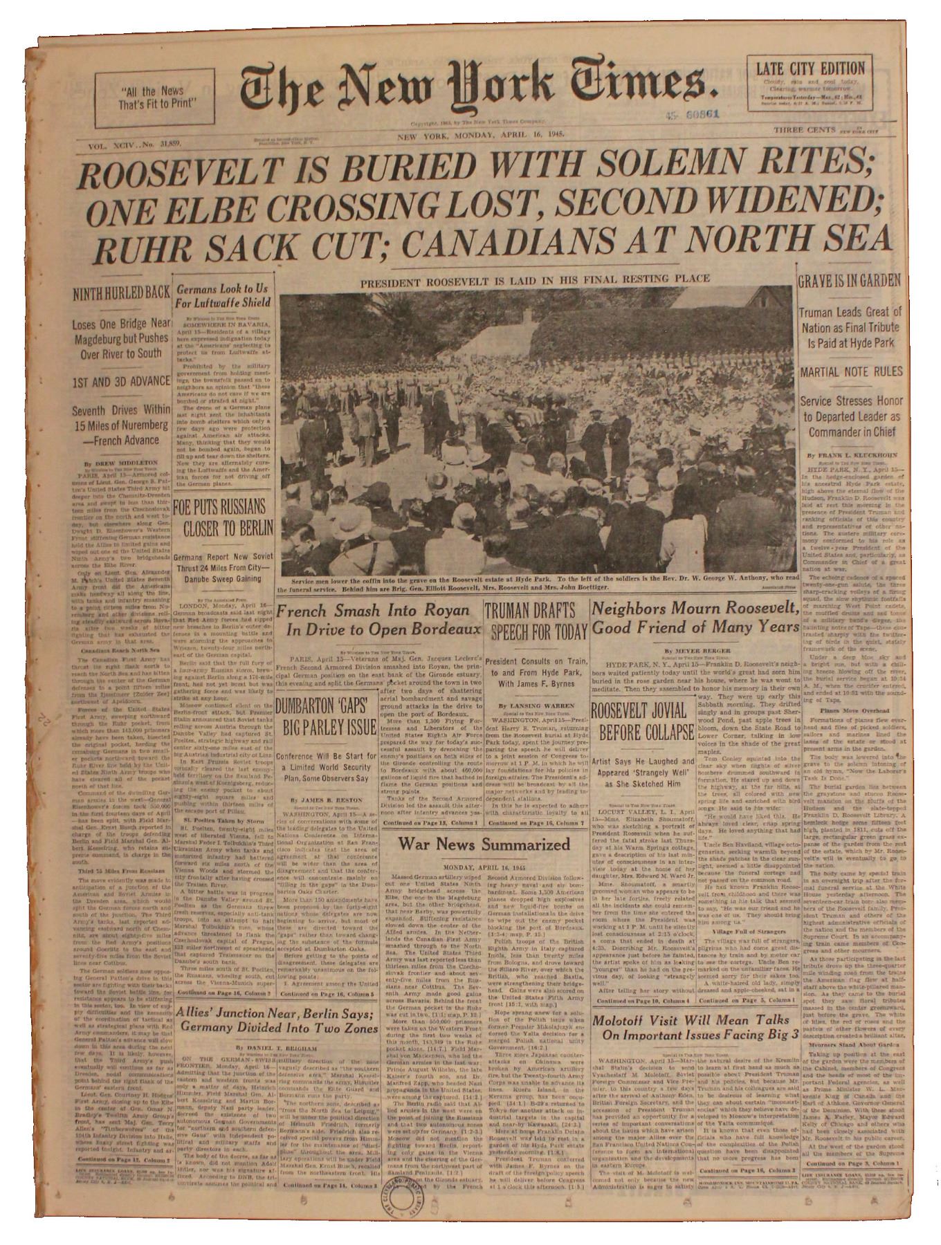 16 April 1945 issue of ''The New York Times'' with extensive coverage of FDR's funeral, including a large picture of the grave lowering in front of a somber crowd. Paper is also full of WWII news. Headlines read: ''Allies' Junction Near, Berlin Says'' and ''Seventh Drives Within 15 Miles of Nuremberg''. Roosevelt coverage includes a story about the speech Truman drafted for the funeral, details of the gravesite and interviews with Roosevelt's friends. Measures 16.5'' x 22.5'' and runs 34pp. Some chipping to left binding. Very good condition.