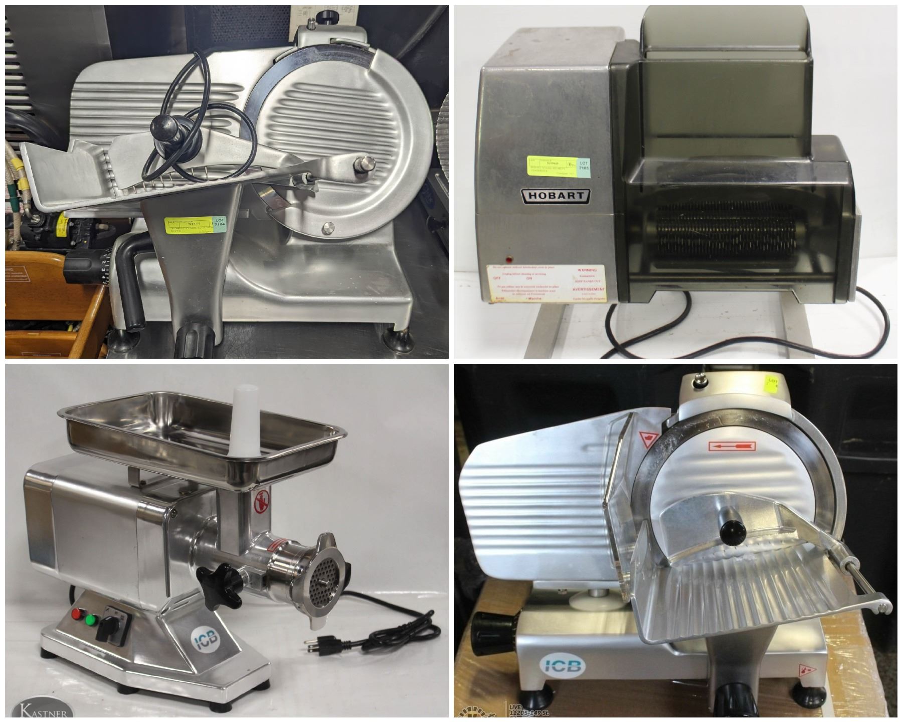 TO BID, SEARCH THE CORESPONDING LOT #. GLOBE 12" SLICER: 7104, NEW 9" SLICER: 7125, HOBART MEAT TENDERIZER: 7105, NEW MEAT GRINDER: 7124.
