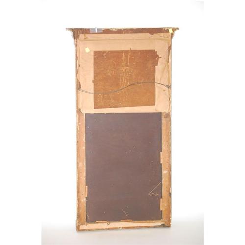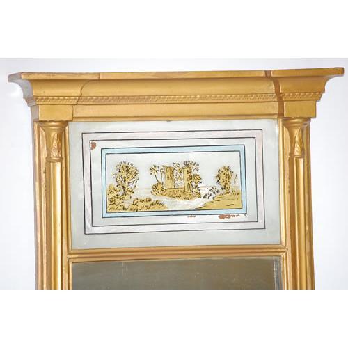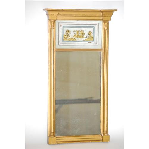 FEDERAL 2 PART TABERNACLE PICTURE MIRROR - LONG GOLD PAINTED ARCHITECTURAL FRAMED MIRROR W/ GILT REVERSE PAINTING ON GLASS PANEL OF A CASTLE ON AN ISLAND (37 1/2" T X 20 1/2" W) - WEAR, LOSSES TO REVERSE PAINTING & GOLD, IMPERFECTIONS