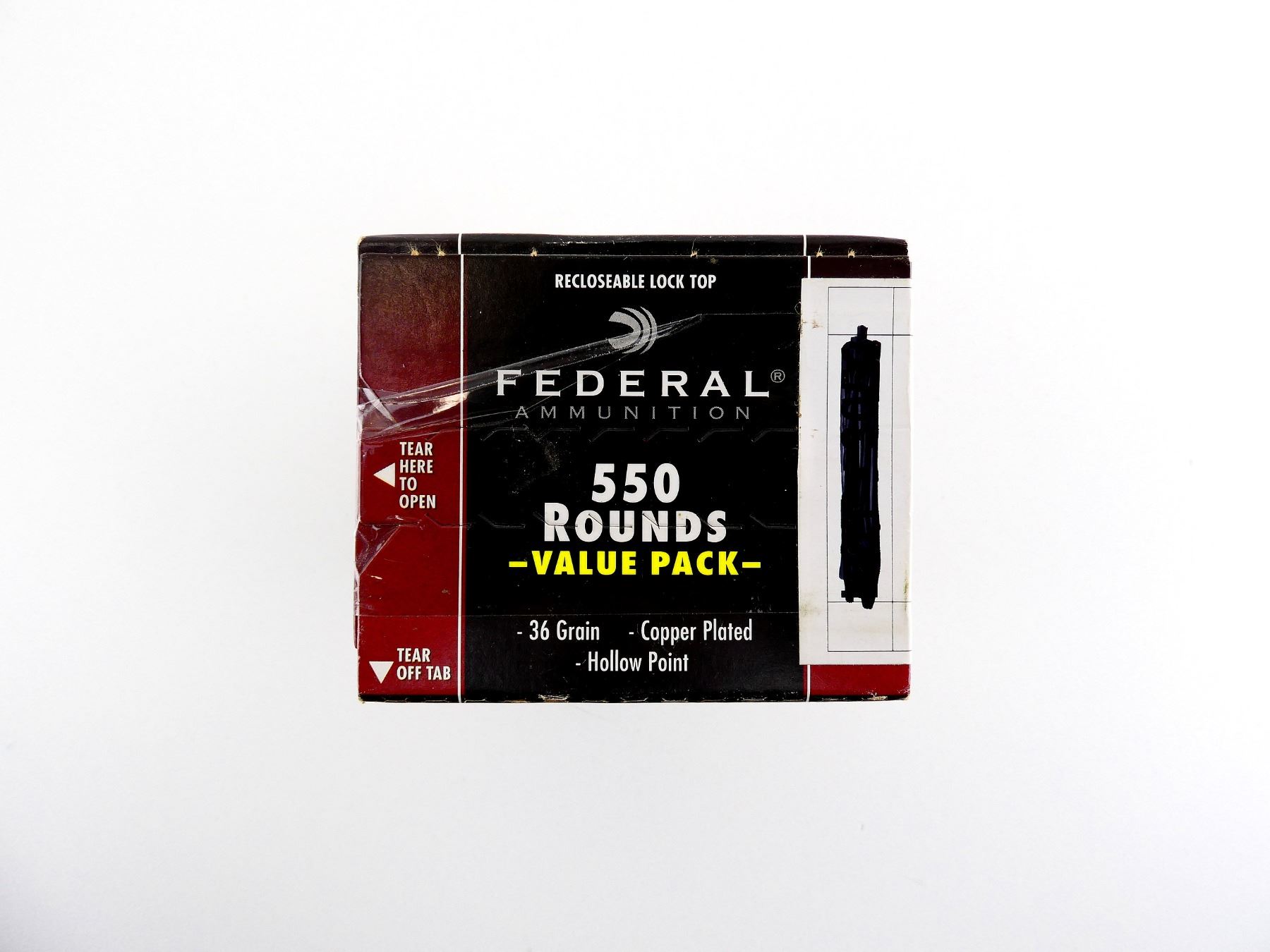 LOT INCLUDES; APPROX. (550) RNDS, 36 GRNS (STATED ON BOX NOT CONFIRMED),COPPER PLATED HP, UNOPENED.
