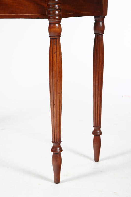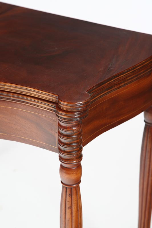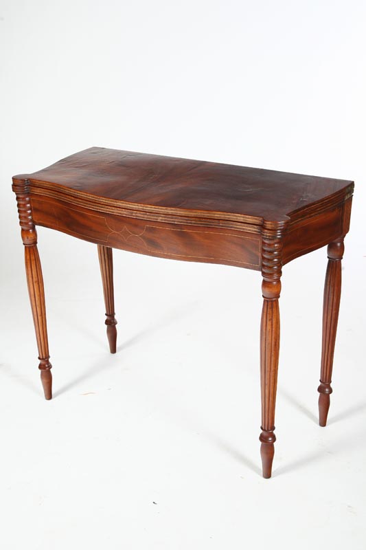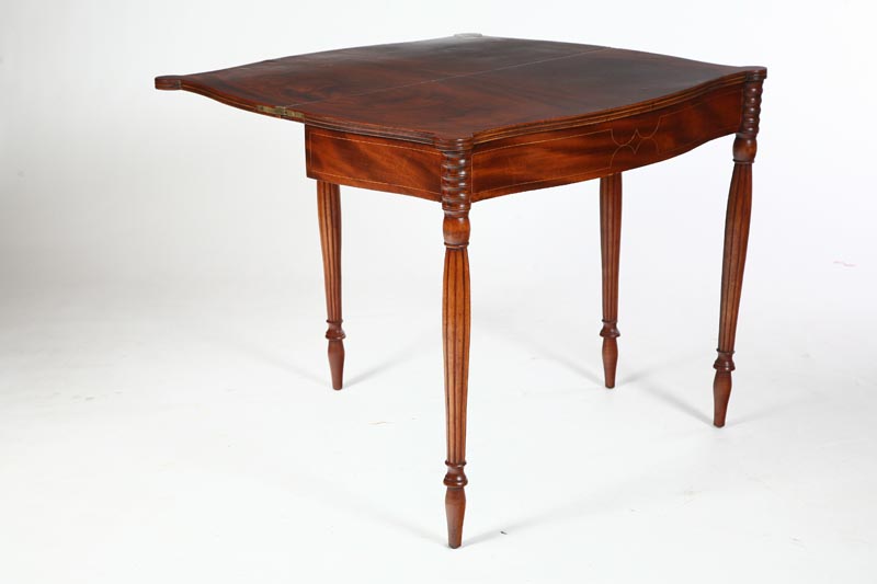 American, early 19th century, mahogany. Turned, reeded legs, serpentine front with conforming top and biscuit corners. Apron has string inlay. Imperfections. 30 1/2"h. 36"w. 17"d., 34"d. open.