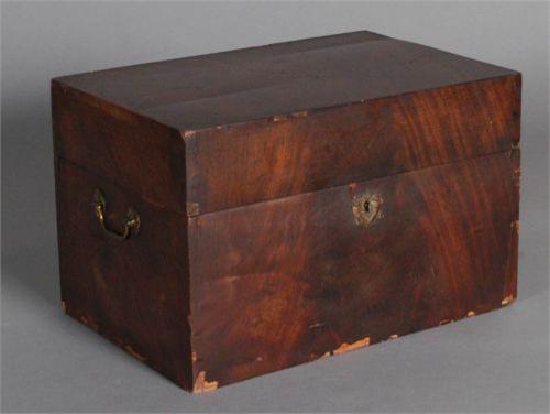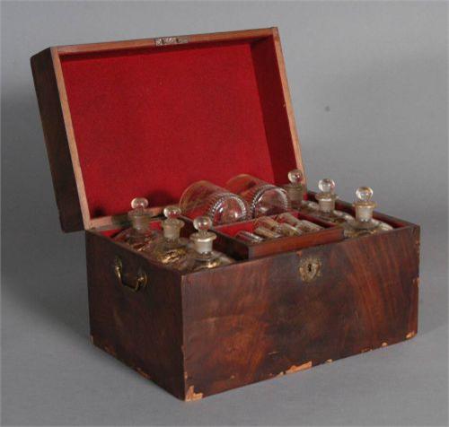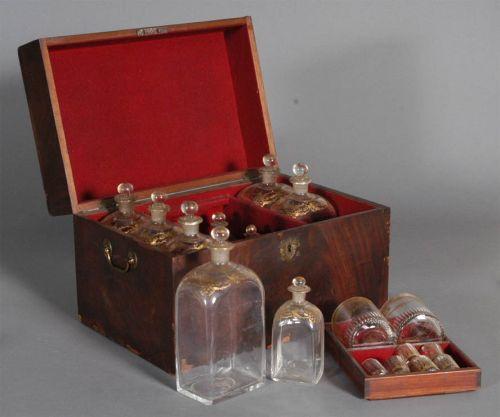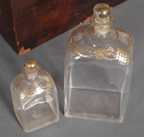 FEDERAL CASED DECANTER SET, fitted with 6 large decanters, 6 small decanters, 6 shot glasses and 2 tumblers- all matching with gilt decoration. lacking 2 shot glasses and some chips to stoppers, case with normal scratches and nicks, circa 1810, SHIPPING: