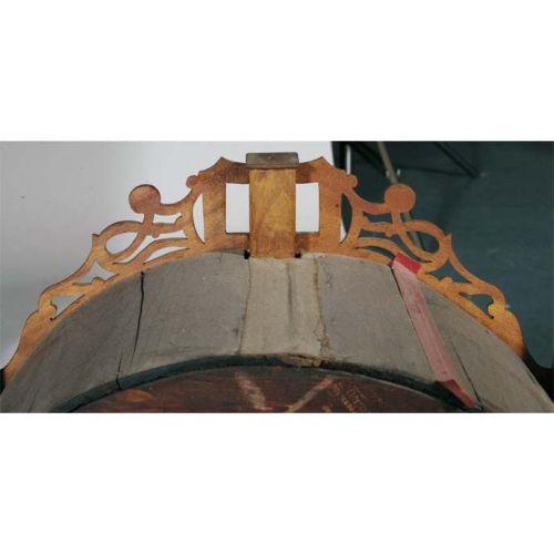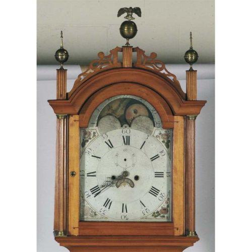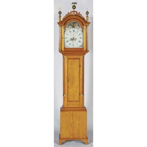 1 FEDERAL CHERRY TALL CLOCK with inlay and moon phase dial 95 1/2" high early 19th century- movement by association, fretwork, capitals and finials are replacements, base reworked.