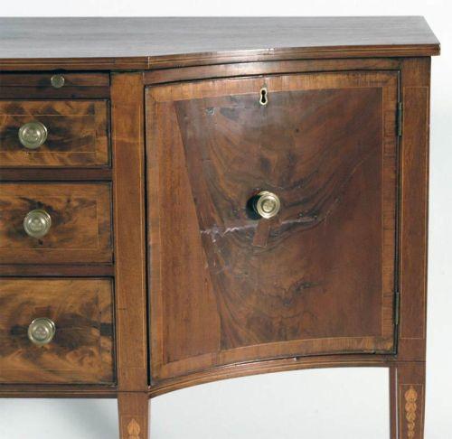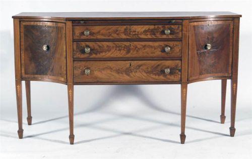 FEDERAL INLAID MAHOGANY SIDEBOARD 72" long, 40" high, 25" deep, CONDITION: refinished, significant veneer patching and putty filler to front doors and drawers,