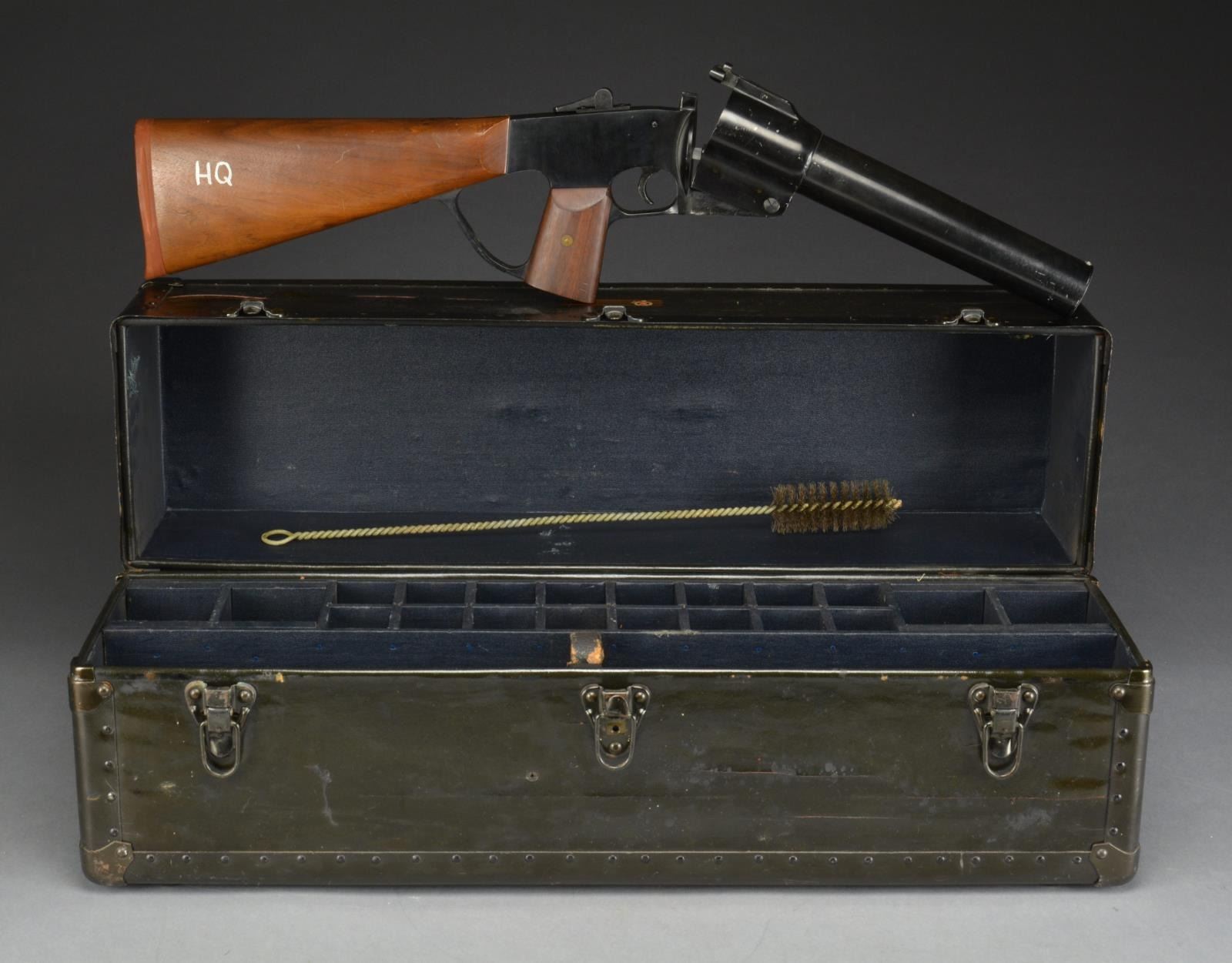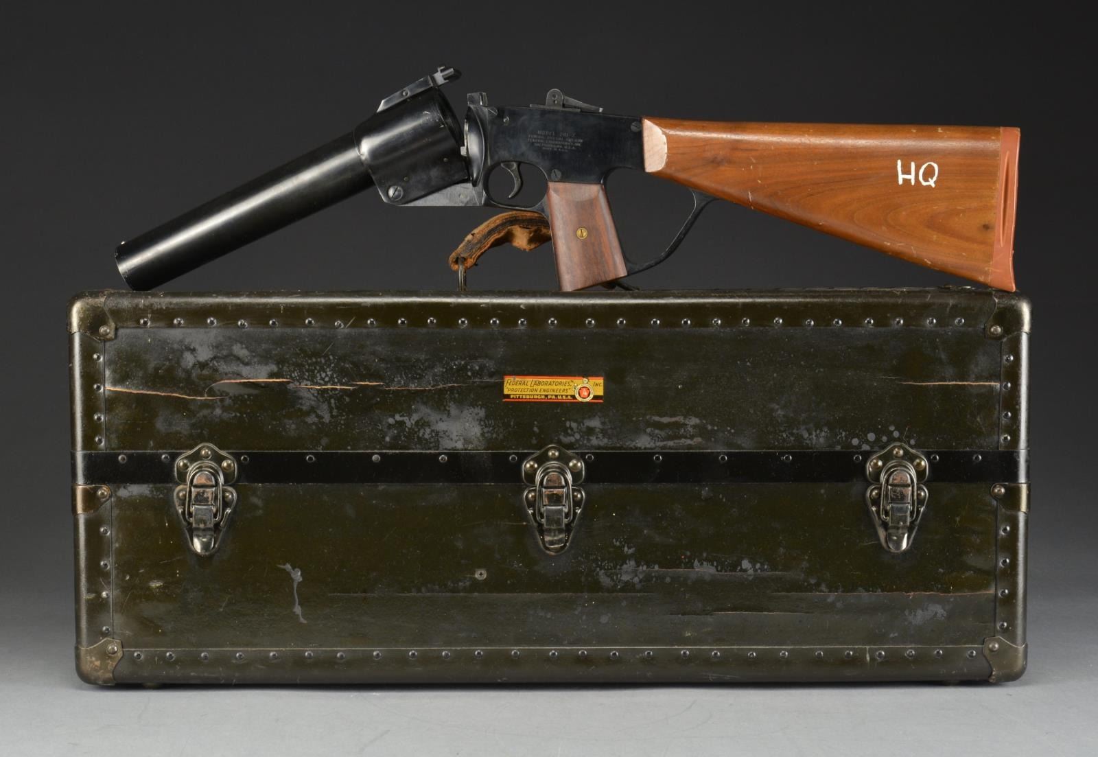 Cal. 37mm. S# G27687. Bbl. 12". Probably the best civilian variant of the iconic M79 “Thumper” 40mm launcher. Unlike the M79, the Federal Laboratories Model 201-Z, 37mm launcher does not require NFA paperwork, nor is it even considered a firearm. Bead style front sight w/ 50yd. rear peep sight integral to the takedown lever, also a dual aperture flip up rear peep sight for 75 & 100yds. Hardwood shoulder stock & pistol grip. Receiver is blued while bbl. assembly is painted a matching black. 3/4" Recoil pad on shoulder stock. Stock painted “HQ” on both sides in white paint. UNATTACHED ACCESSORIES: an original "Federal Laboratories" storage & transport case w/ cleaning brush. Case measurements are approx. 29.5" long, 8" wide, 12.5" deep w/ 16 slots for ammunition, 4 accessory slots, & 1 slot for the launcher. CONDITION: wood stocks display scratches & depressions w/ no apparent structural damage. Finish on exposed metal surfaces is mostly complete, except for thinning on high areas. Bore is unusually clean compared to the vast majority we’ve encountered. The corrosive properties of the lift charges are damaging to internals w/ out proper maintenance, however this one has not succumbed to this kind of abuse. Front sight bead has been worn down. Fire control mechanism appears to function correctly when cycled by hand. (02-14175/JZ). NON-GUN. $300-500.