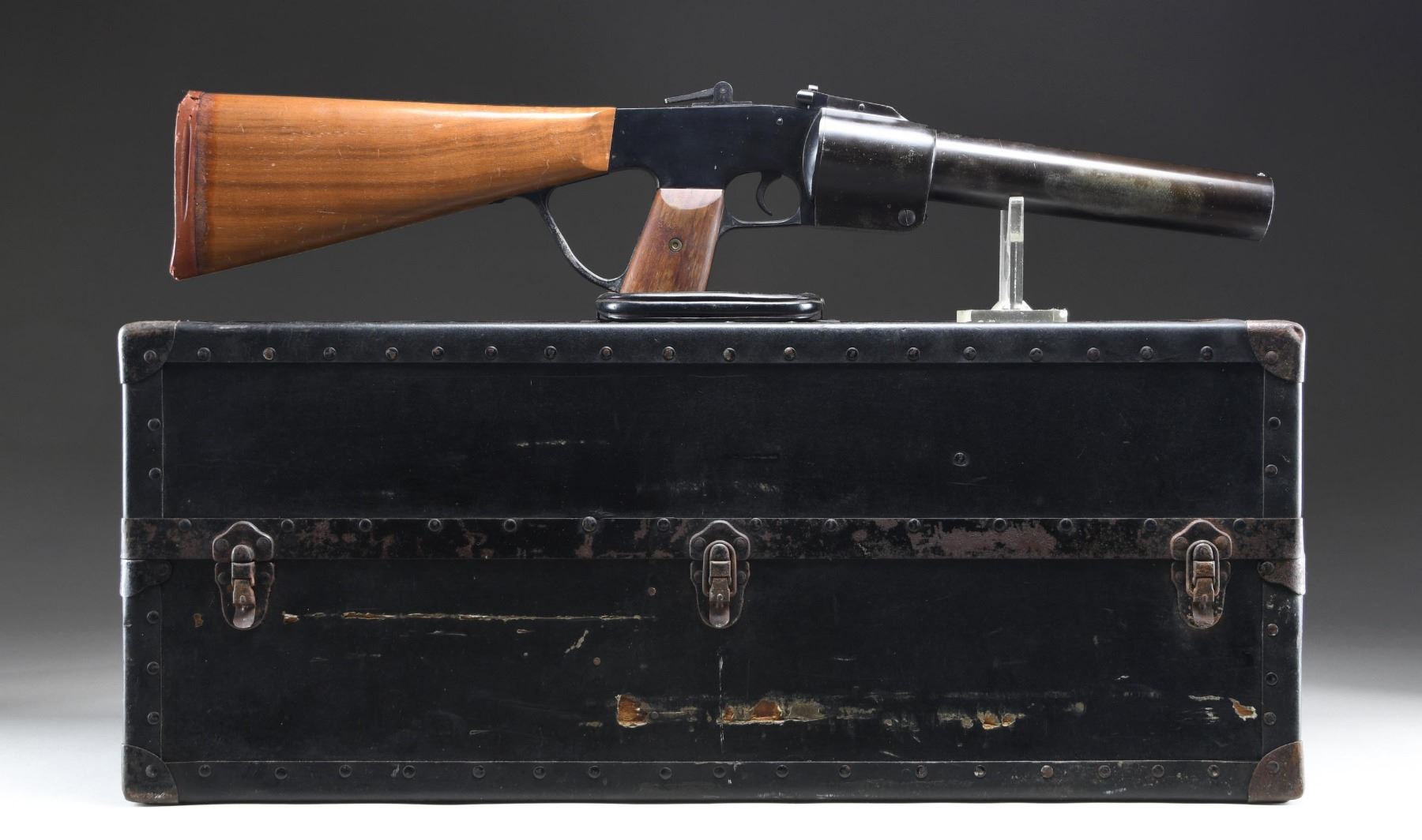 CASE. Cal. 37mm. S# G20738. Bbl. 12". Model 201-Z "FRG" (Federal Riot Gun) riot gun mfg. by Federal Laboratories as a means to fire non-lethal ammunition. Left side of the receiver is marked with the model designation, above Federal Laboratories mfg. information, with the S# marked on the underside. Alloy components exhibit a blue finish. Plain wood buttstock, with red rubber recoil pad, and 2-piece plain wood grips. Bead front sight, with fixed peep rear sight and flip-up dual peep rear sight. UNATTACHED ACCESSORIES: original wood case, featuring metal reinforcements along the edges, and containing a parts list and copy of a catalogue listing. CONDITION: good, with metal components retaining large amounts of their original blue finish, exhibiting areas of wear and thinning that show through to gray patina, primarily on the bbl. Bright bore. Wood furniture is good, showing some scattered superficial handling marks overall. Rubber recoil pad has hardened, showing cracking and losses primarily around the upper and lower edges. Case shows scattered marks and some losses, with areas of oxidation present on the metal reinforcements. Leather handle shows some cracking and a few concentrated areas of crazing, but otherwise remains serviceable. (02-23734/MLW). $500-900.