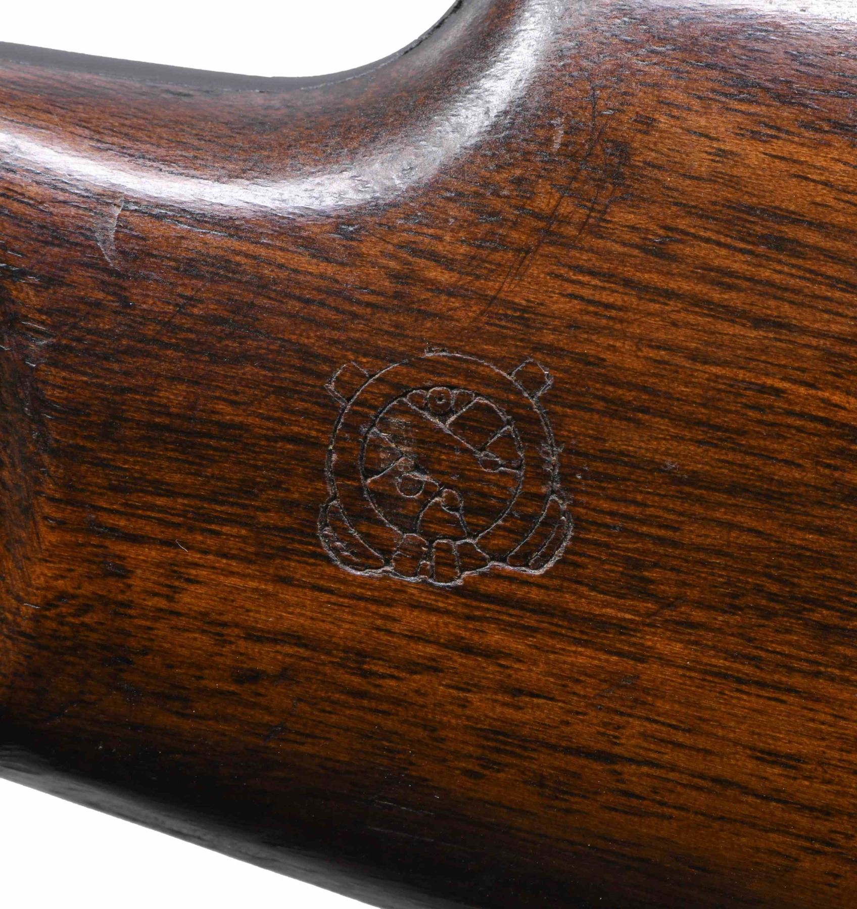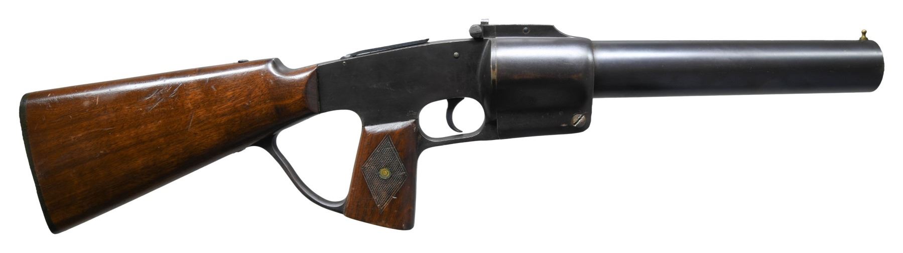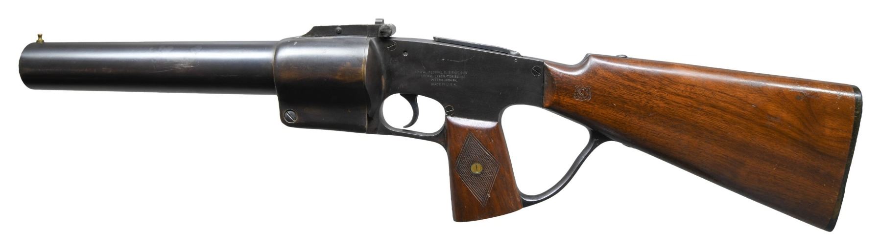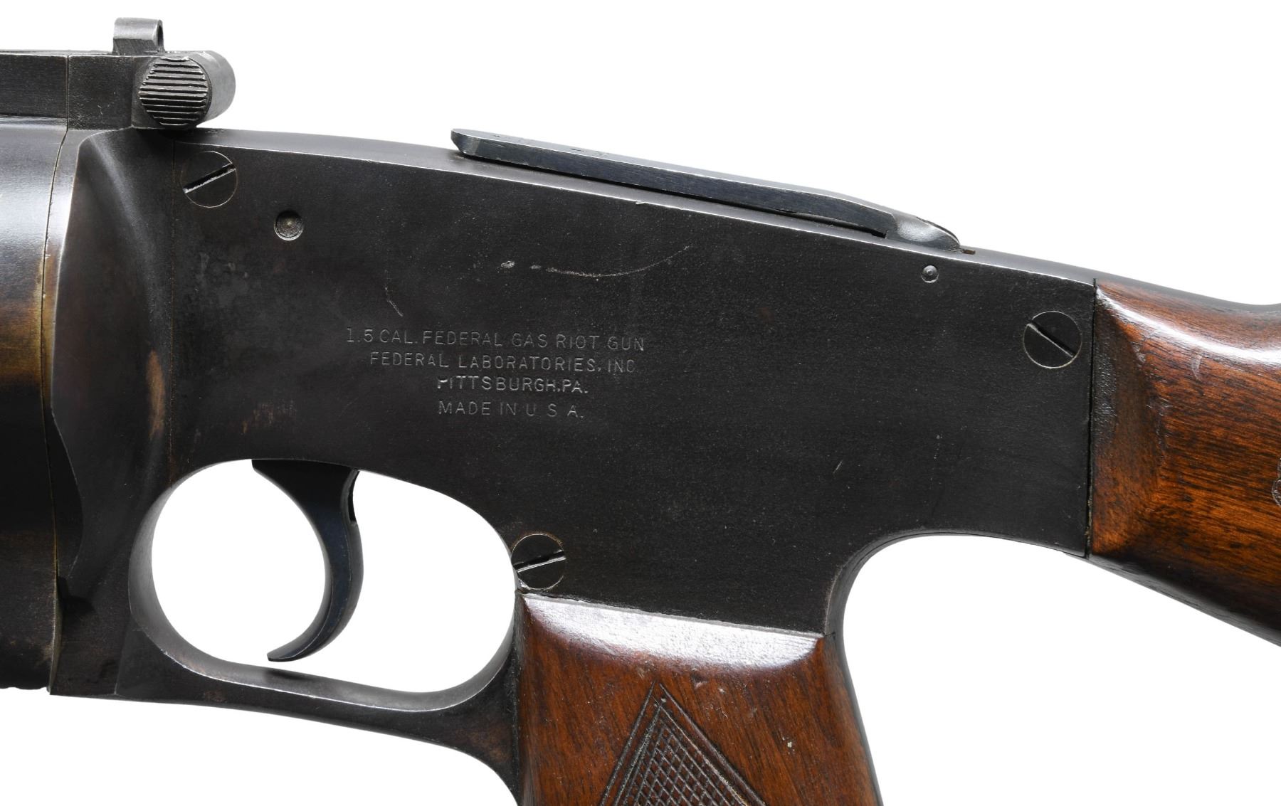 Cal. 37mm. S# 4291. Matching numbers on receiver & barrel. Bbl. 12" smooth bore. Aperture rear sight integral w/ opening latch for 50 yards. Fold-up aperture rear sight on top tang w/ apertures for 75 & 100 yards. Brass bead front sight. Receiver marked on left side "1.5 CAL. FEDERAL GAS RIOT GUN / FEDERAL LABORATORIES, INC / PITTSBURGH PA / MADE IN USA". Walnut buttstock & grips. Buttstock is marked on left side w/ ordnance "crossed cannons". Black plastic buttplate. Checkered walnut grips retained by brass screw. CONDITION: stock set has moderate wear & handling marks throughout w/ flaking original finish. Checkering on grips has worn diamonds. Metal retains 80% original blue finish w/ thinning & wear. Good bore w/ dull appearance. (02-25087/RW). NON-GUN. $700-1,000.