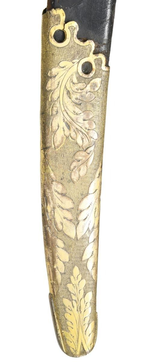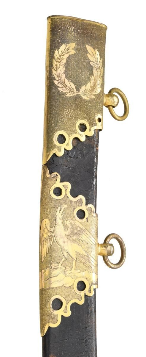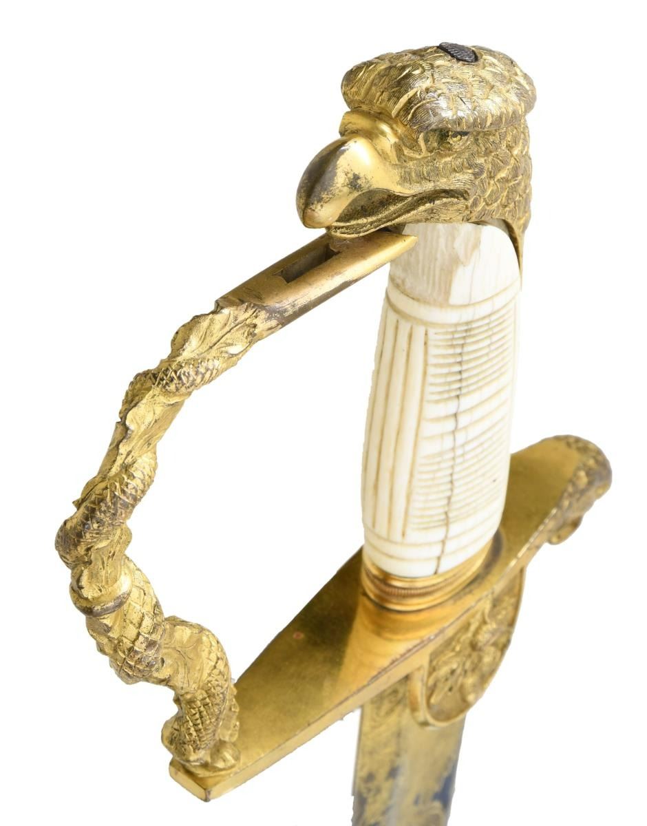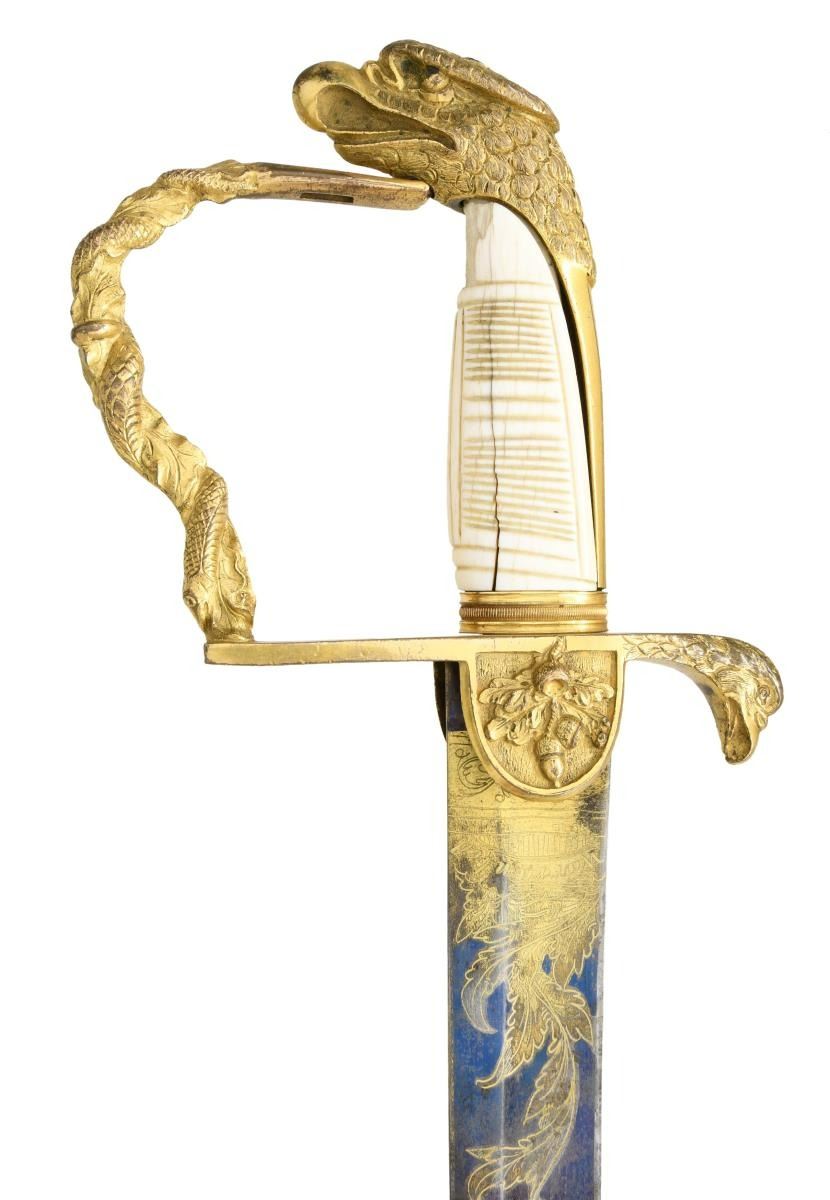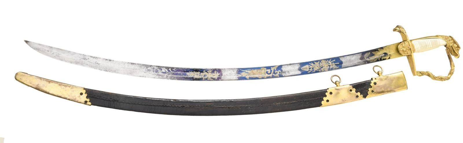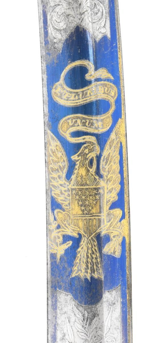 INTRIGUING TRI-COLOR BLADE. Overall length: 38 1/2". Blade length: 33 1/4". Blade has a single wide fuller with gilded etching on a blued field amongst white panel highlights. This beautiful blade has 4 separate areas of gilded etching on each side separated by white (unblued) foliate decorated panels. Etching includes a large spread-wing American eagle with a ribbon in its beak that reads "E PLURIBUS UNUM". There is also a seated Indian warrior princess, 2 large sprays of arms, and 4 areas of foliate decoration. There is a scallop topped banner near the ricasso that reads "WARRANTED". Gilded brass hilt includes an exceptionally well-done feathered eagle head quillon, and both languets are embellished with oak leaves & acorns. The knuckle bow features a seldom seen, well-articulated serpent curled around oak leaves. The eagle head pommel shows intricate detail and flows seamlessly into a faceted backstrap. Carved ivory grip with both horizonal & vertical linear decoration. Gilded brass mounted leather scabbard has a wreath engraved on the top mount. A large American eagle on rocks adorns the middle mount, and there is ample foliate decoration covering the tip/drag. Obviously, a sword for a very high-ranking officer, possibly a General. CONDITION: the blade has a few areas of cleaned pitting near the tip not affecting the highly decorative blade. Nearly all of the gilded highlights remain in the etching, and the blued field is 90% and retains stunning color. The 3 white panels on each side of the blade serve to highlight & even accentuate the fine etching. The hilt retains nearly all of its original gilded finish. There is one notable age crack in the body of the grip and some minor chipping at the base of the pommel. The scabbard remains quite solid, but the body is a bit flexed and very slightly flaked. The mounts retain nearly all of their original gilded finish. (02-19965/BF). $3,500-6,500.