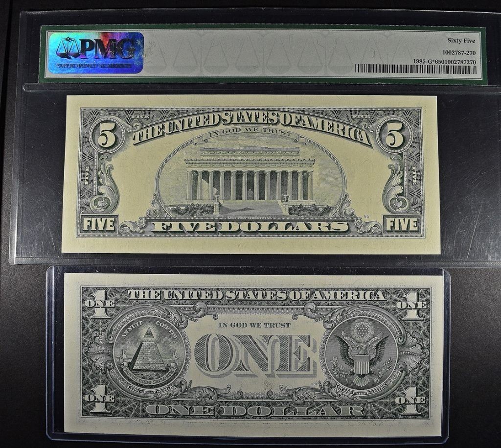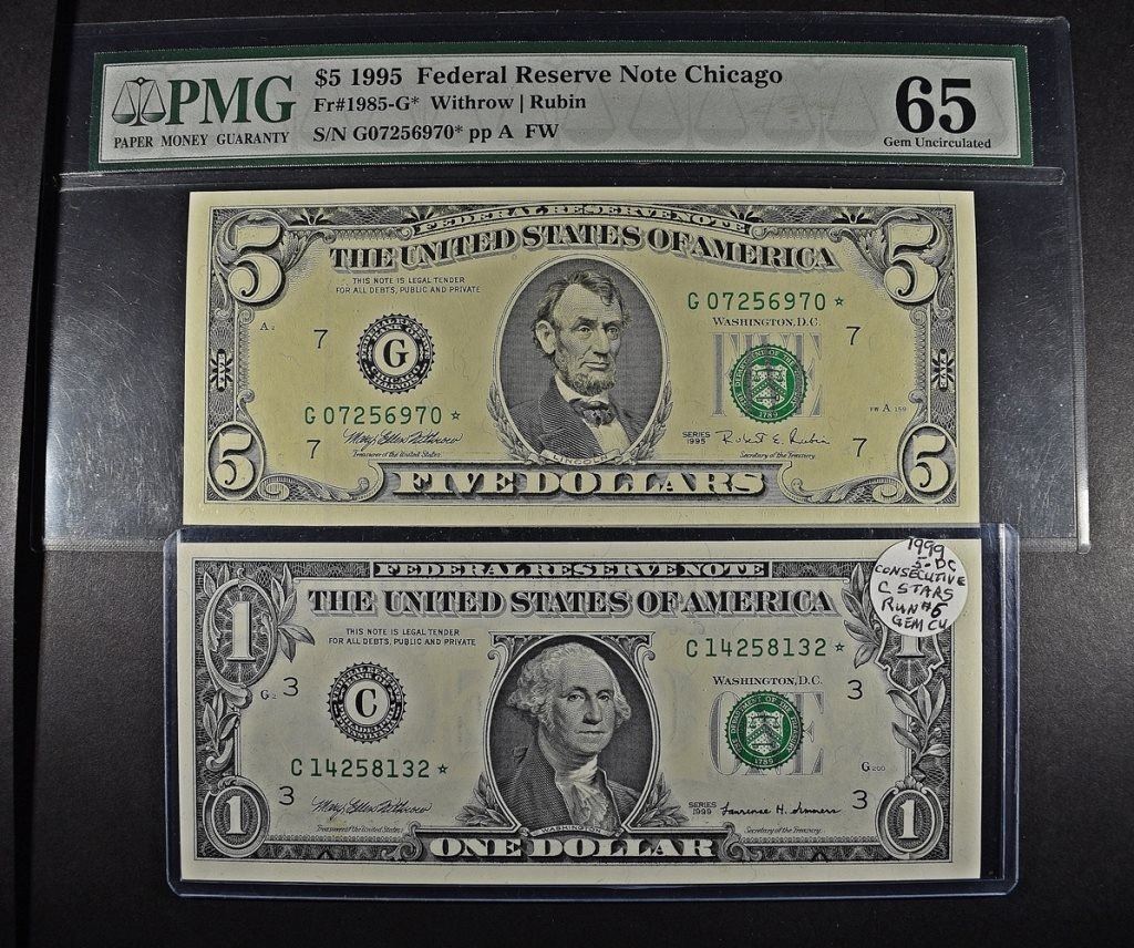 1995 $5 FRN PMG 65 & 5 CON SERIAL # 1999 $1 STAR NOTES ESTIMATE $50 - $75.