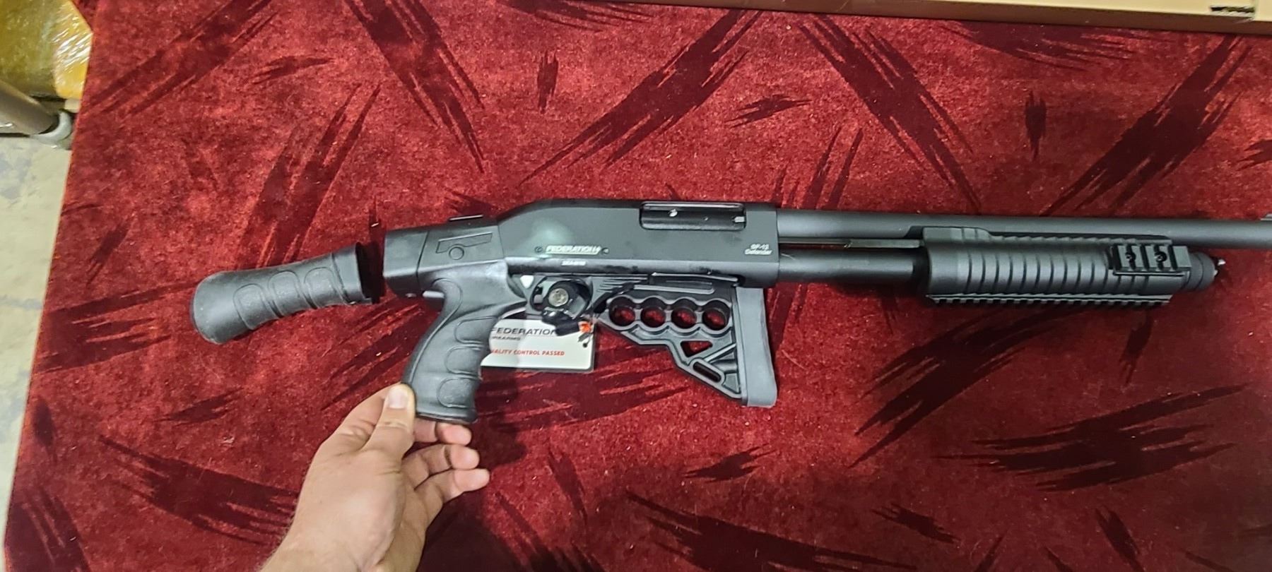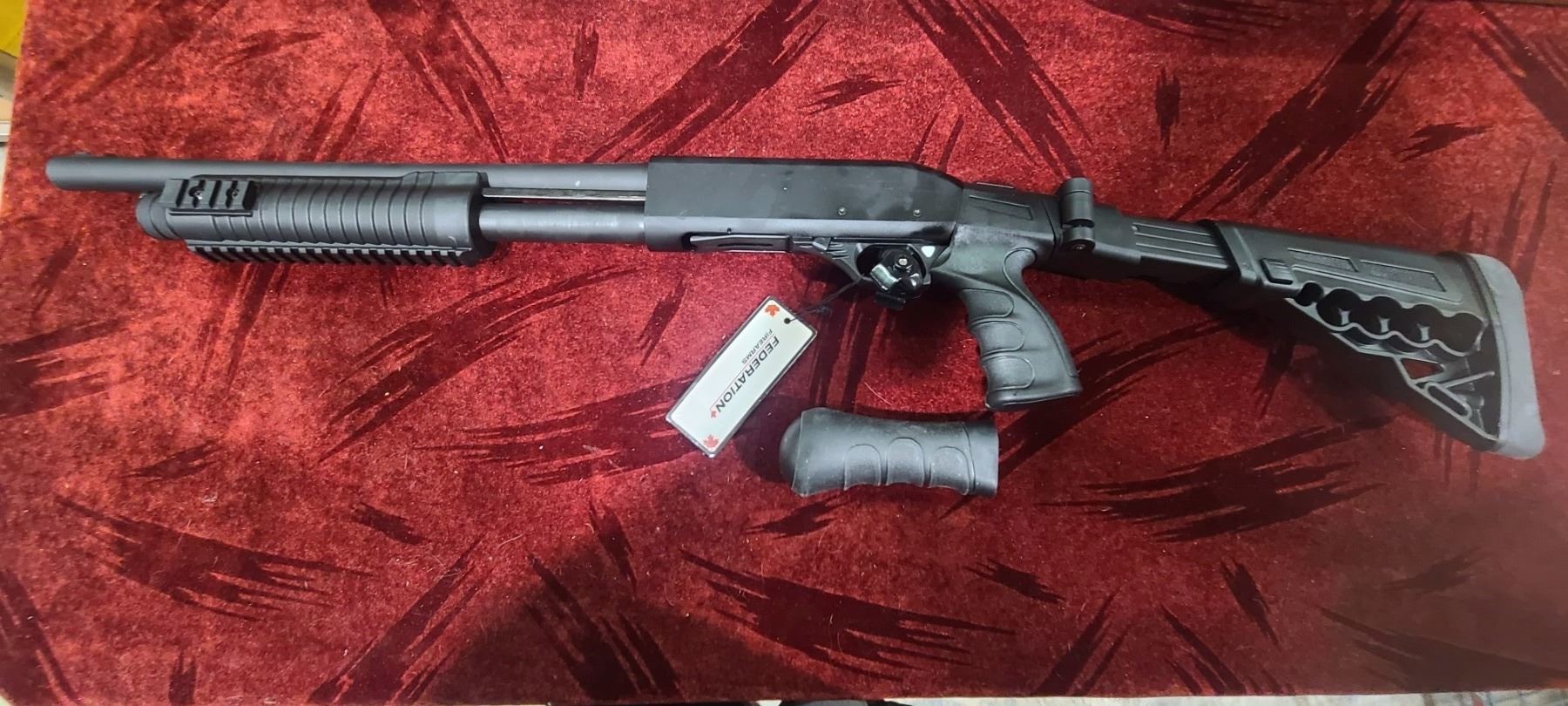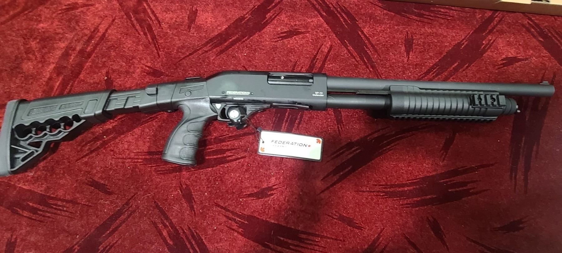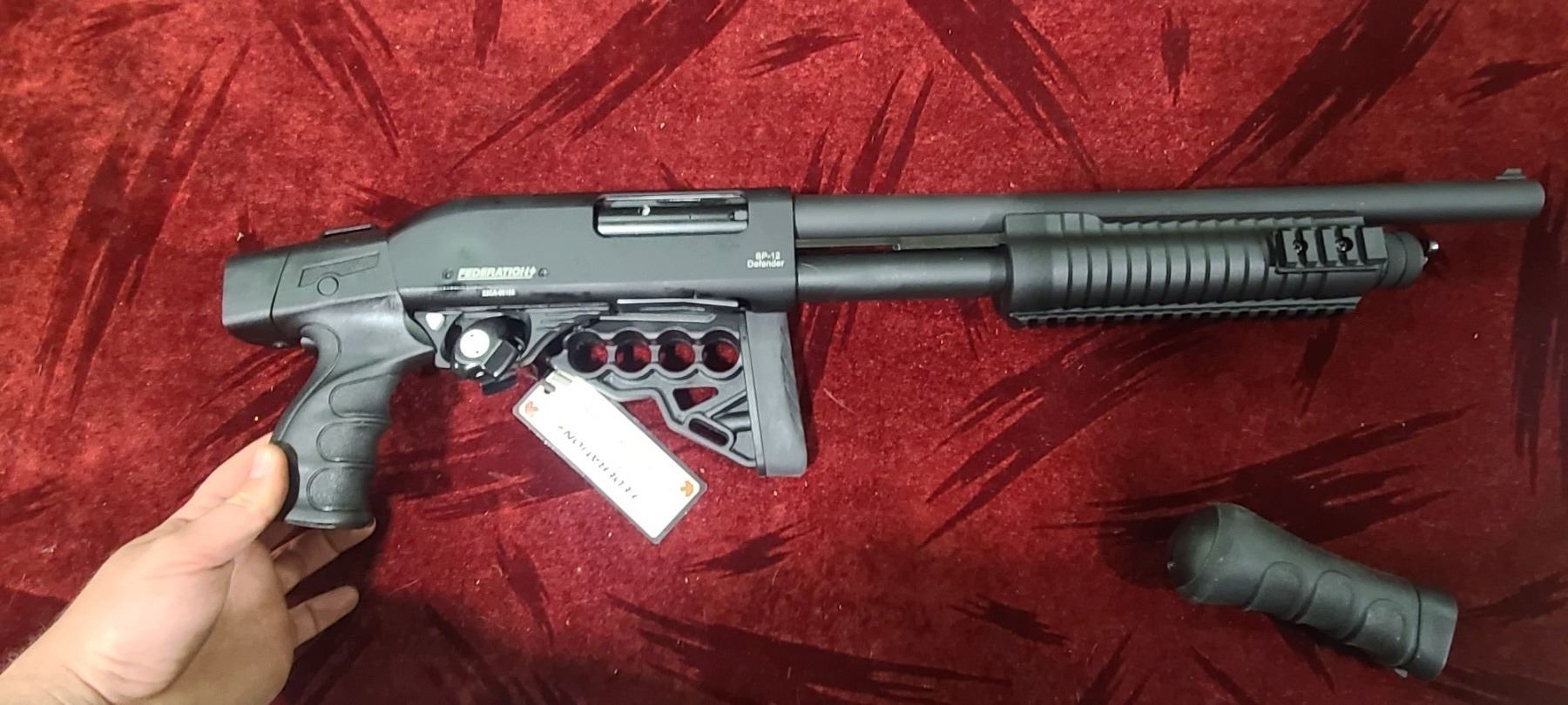 FEDERATION FIREARMS PUMP ACTION 12GA MODEL SP-12 DEFENDER. CHAMBERED FOR 3" AND 2 3/4" WITH A 16 1/2" BARREL. COMES WITH FOLDING AND EXTENDABLE STOCK AS WELL AS A INTERCHANGABLE BIRDS HEADS GRIP