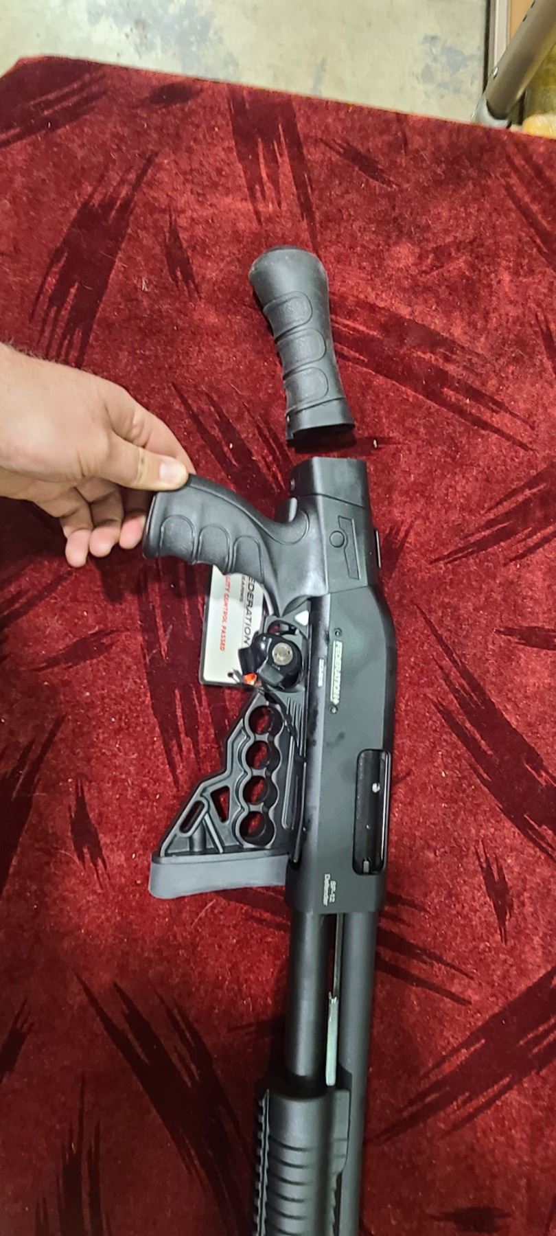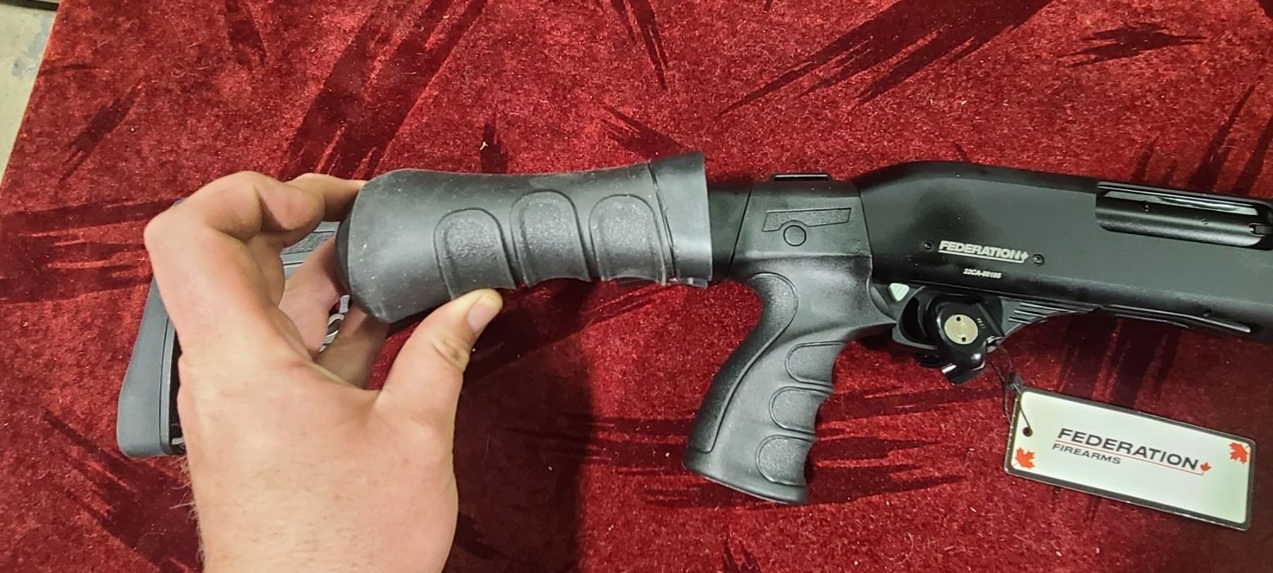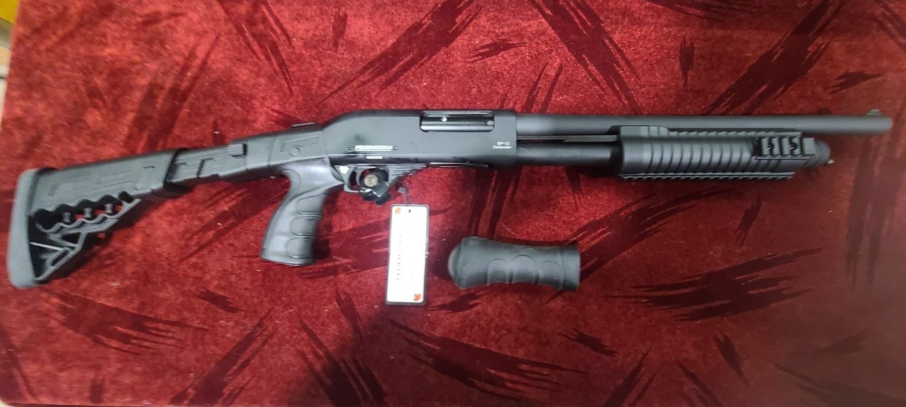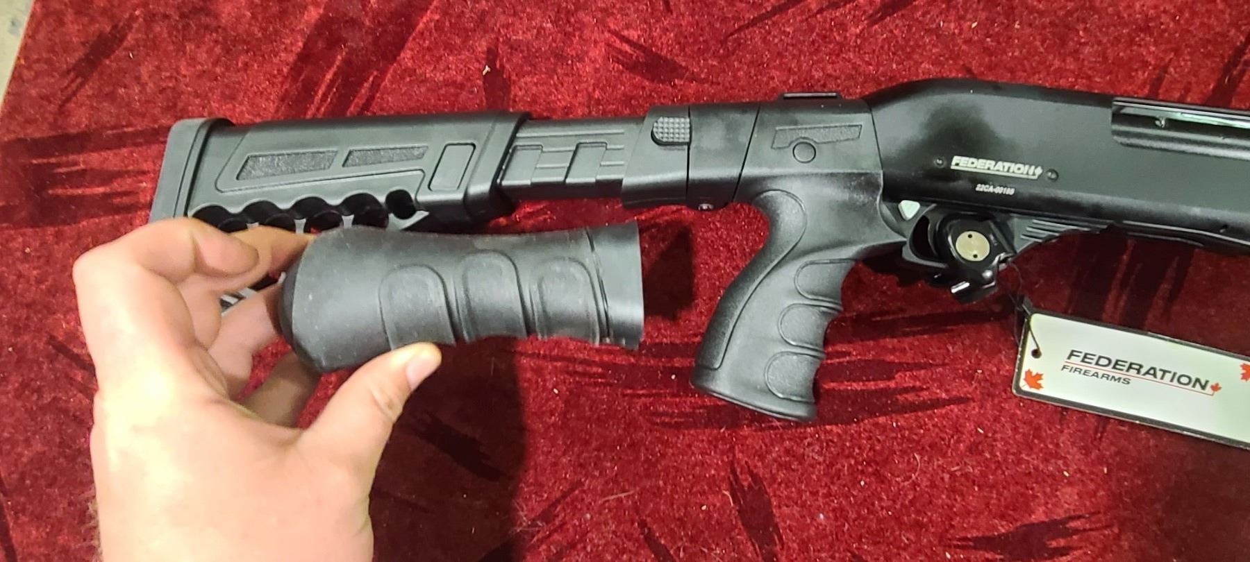 FEDERATION FIREARMS PUMP ACTION 12GA MODEL SP-12 DEFENDER. CHAMBERED FOR 3" AND 2 3/4" WITH A 16 1/2" BARREL. COMES WITH FOLDING AND EXTENDABLE STOCK AS WELL AS A INTERCHANGABLE BIRDS HEADS GRIP