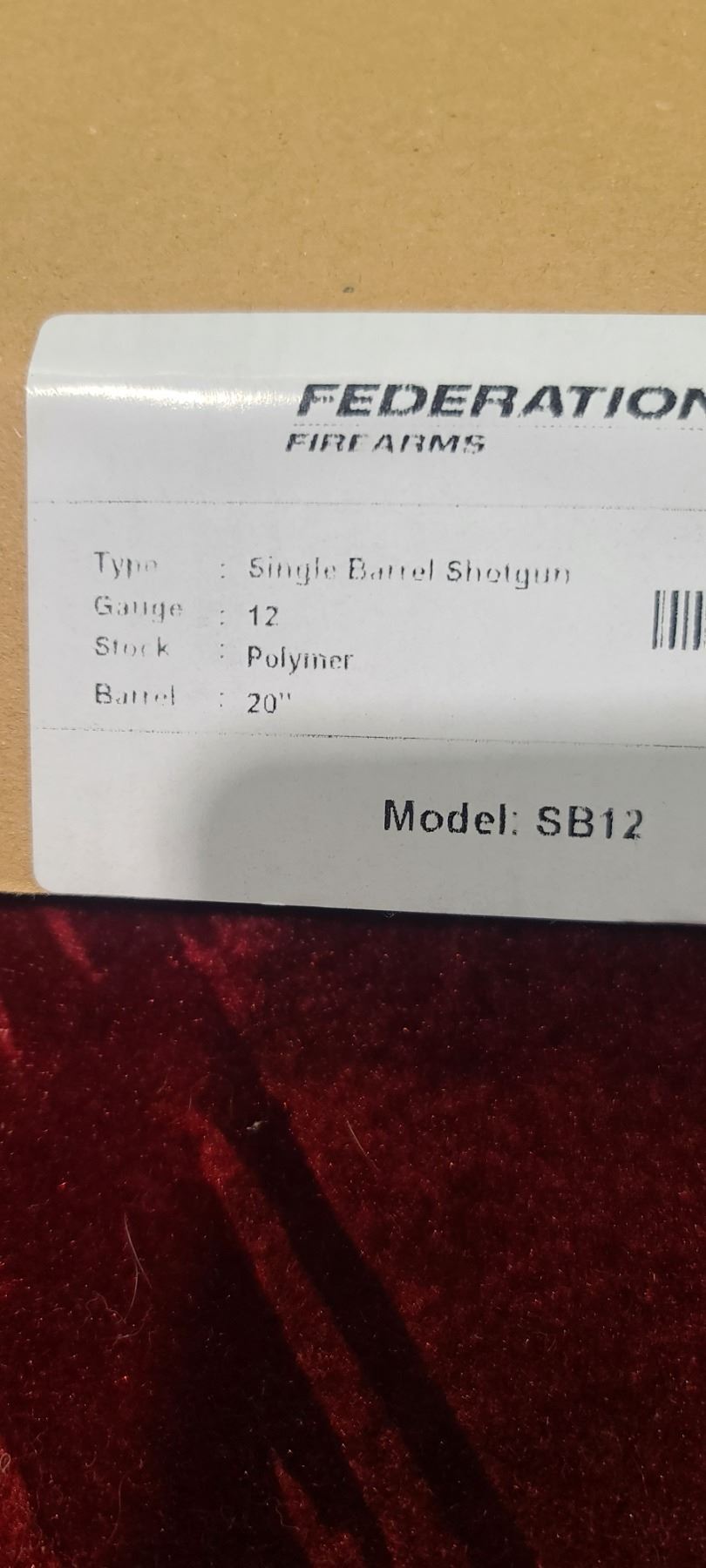 FEDERATION FIREARMS SB12 12GA SINGLE BARREL SHOTGUN WITH A 20" BARREL NEW IN BOX. SN 22CA-00719