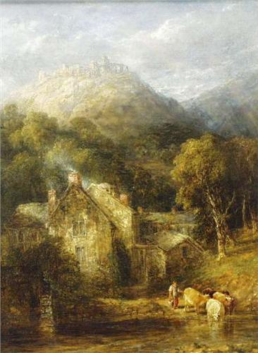 FEDERICK HENRY HENSHAW (1807-1891) English school. "River Scene with Cattle and Farm". Oil on canvas. Signed and dated 1859, lower left. 16" x 13 1/2". In gilt frame. Ref. Benezit, vol.4, page 664. 2500-3000