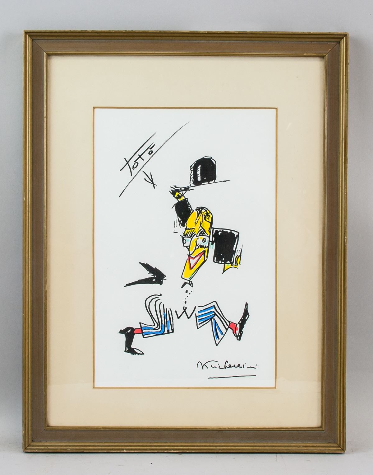 Mixed media on paper, framed. Featuring a figure. Signed and attr. Frederico Fellini (Italian, 1920-1993) on the lower right corner. 29 x 19 cm (11.4 x 7.5 in) (Framed 44 x 34 cm, 17.3 x 13.4 in). Federico Fellini was an Italian visual artist who was born in 1920. Federico Fellini has had several gallery and museum exhibitions, including at the Museo Picasso Málaga and at the Circulo de Bellas Artes. Several works by the artist have been sold at auction, including '2 works: Peter and Tony, The Rovers; Fountain' sold at Bloomsbury Auctions, Rome 'Modern & Contemporary art' in 2012. There have been numerous articles about Federico Fellini, including 'Tony’s Oursler’s Occult Archive—A Family Affair' written by David D'arcy for Observer in 2016. The artist died in 1970. PROVENANCE: Southern Ontario estate