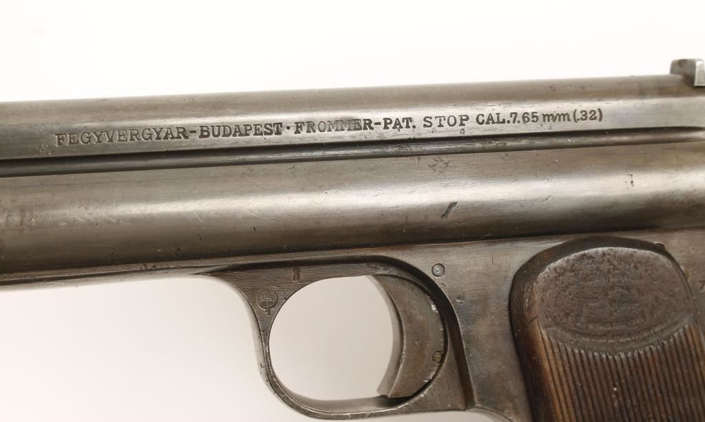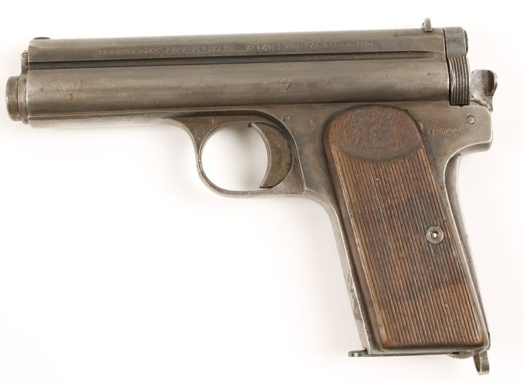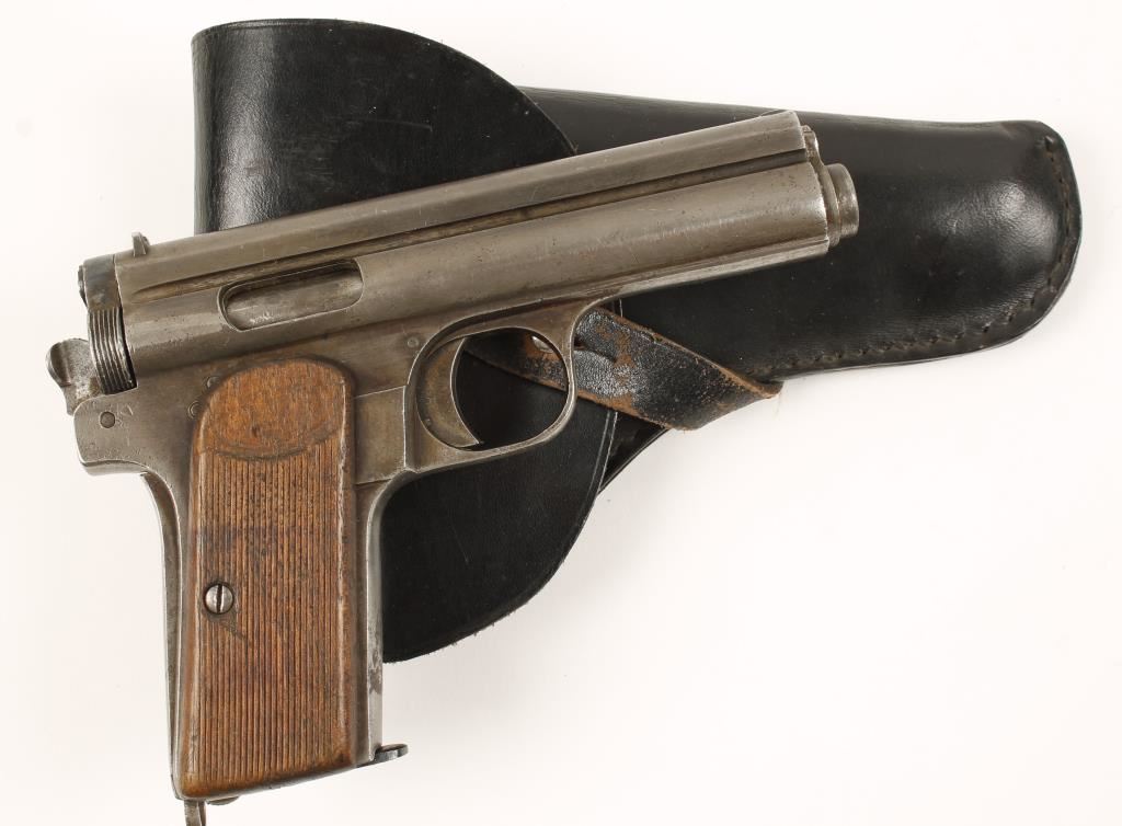 Blued single-action semi-automatic pistol with 3.75" barrel and a leather flap holster. Finish is worn/faded to a uniform silver/grey with few dings and evidence of slight corrosion. Bore is frosted with strong rifling. Serrated wooden grips are very worn with no damage. Function is good. Holster is stamped "Eigentum der Sicherheitswache Wien (Vienna) and it is in very good condition. Condition is fair to good. *Modern Firearm*