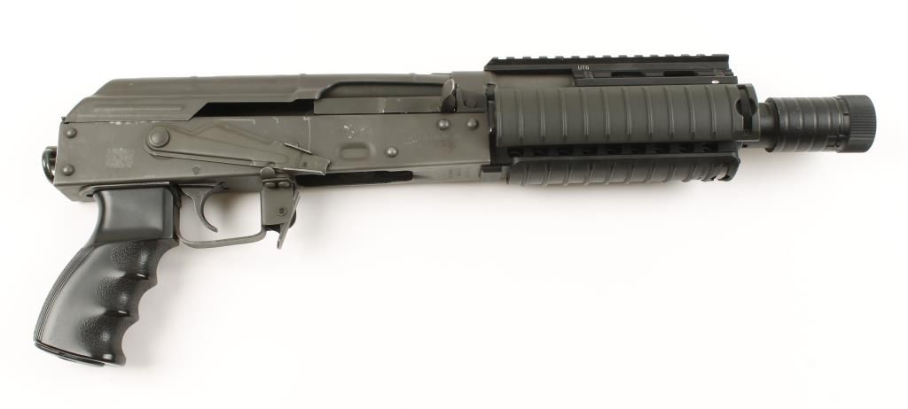 Hungarian made semi auto AK style pistol with 10" barrel. Pebbled plastic pistol grip, UTG accessory rail, Knights Armament hand guard, no sights, and rear sling swivel. Very good bore and action. No magazine. Condition: Overall very good showing little use. *MODERN FIREARM*