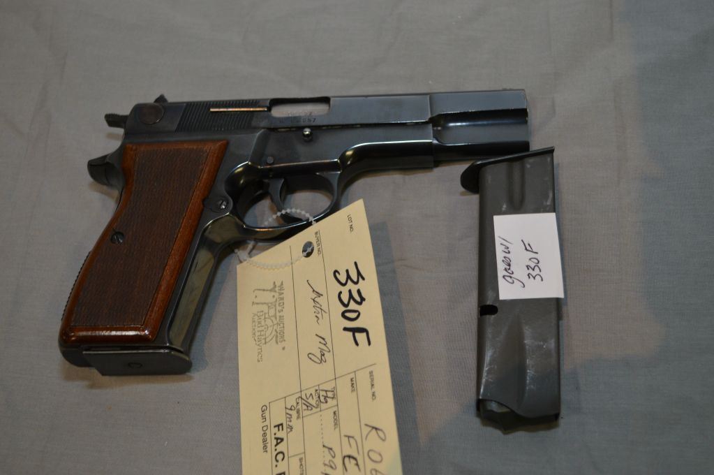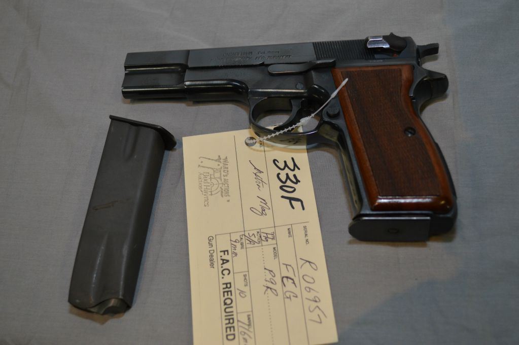 FEG Model P9R .9 MM Luger Cal 10 Shot Semi Auto Pistol w/ 118 mm bbl [ blued finish, fixed sights, checkered wooden grips w/extra mag ] Ser # R06957 Restricted Handgun Cert # 839766
