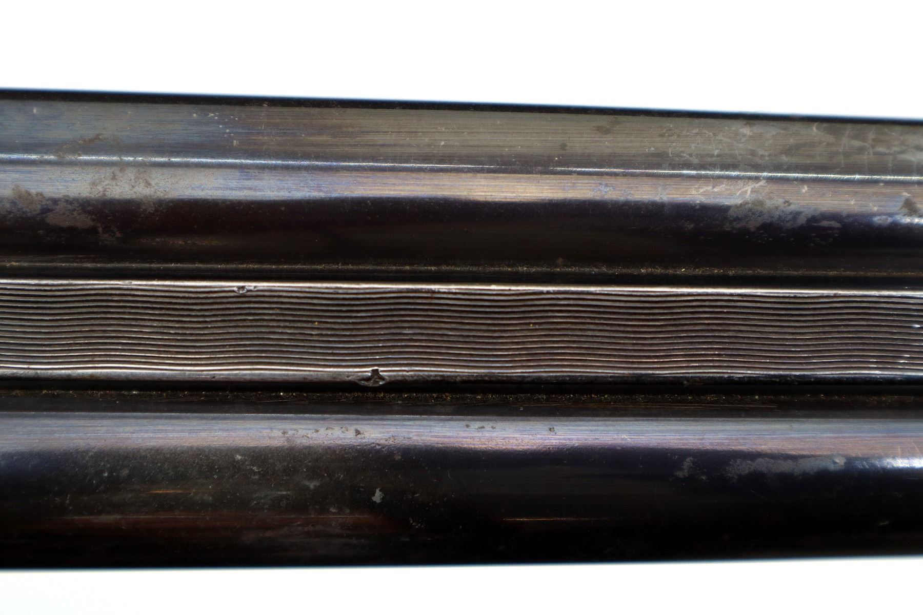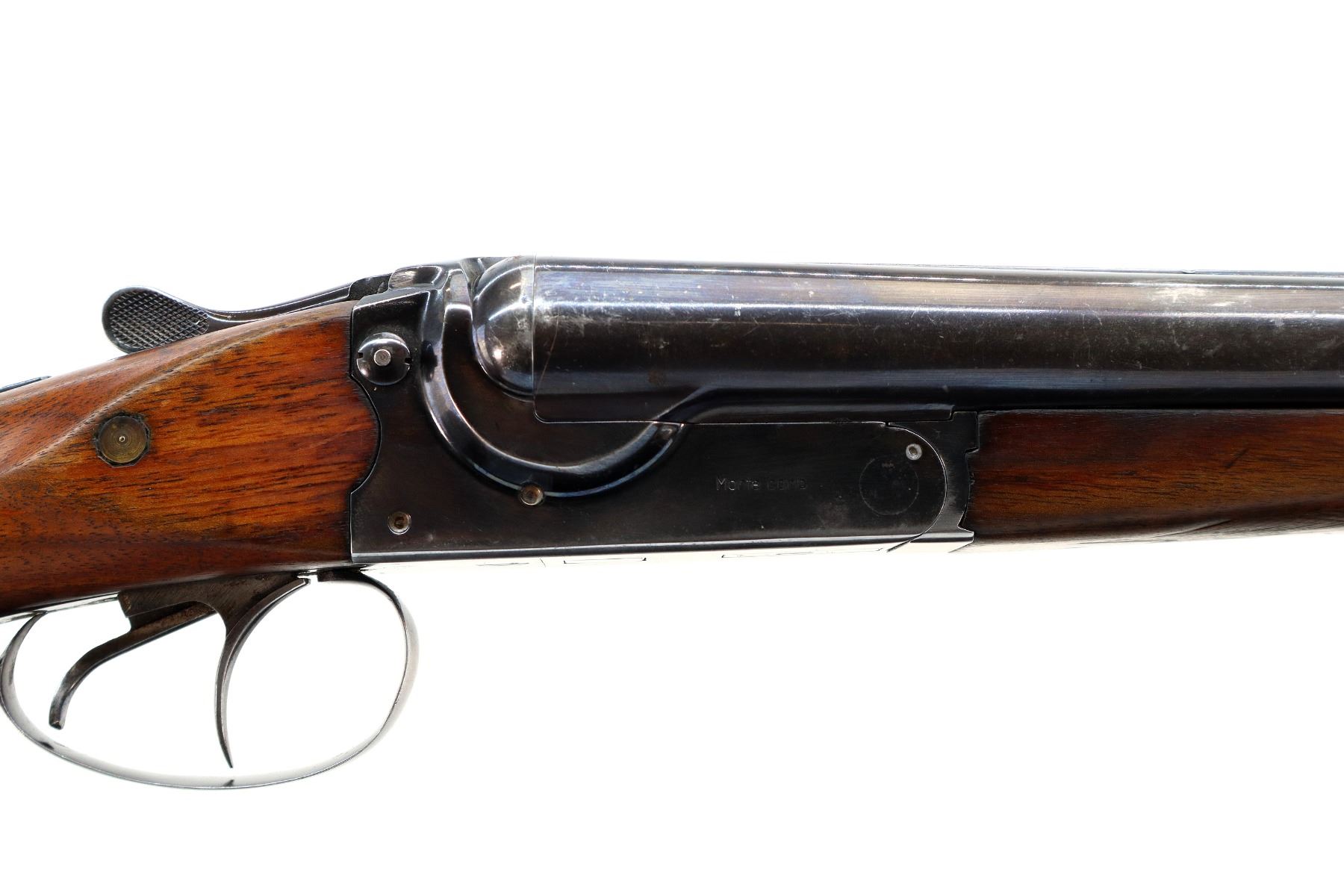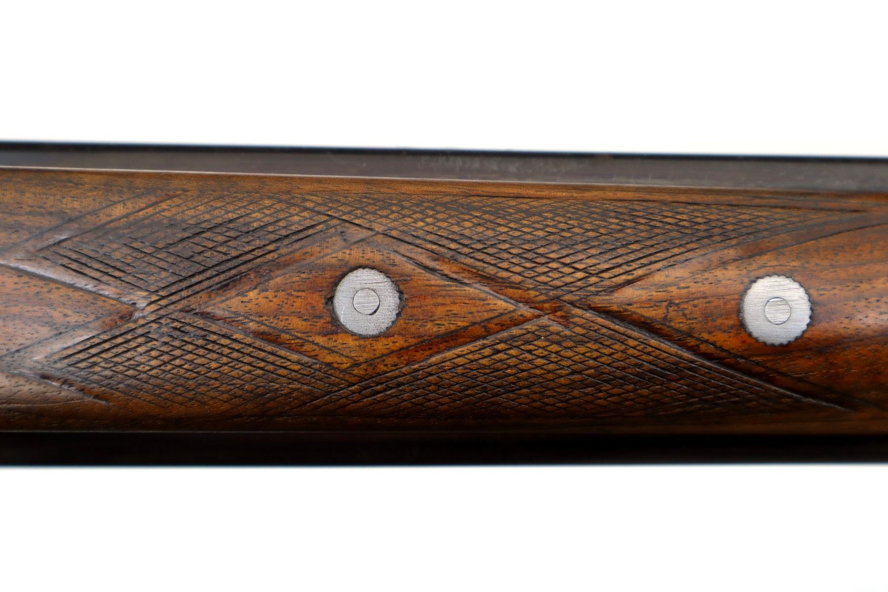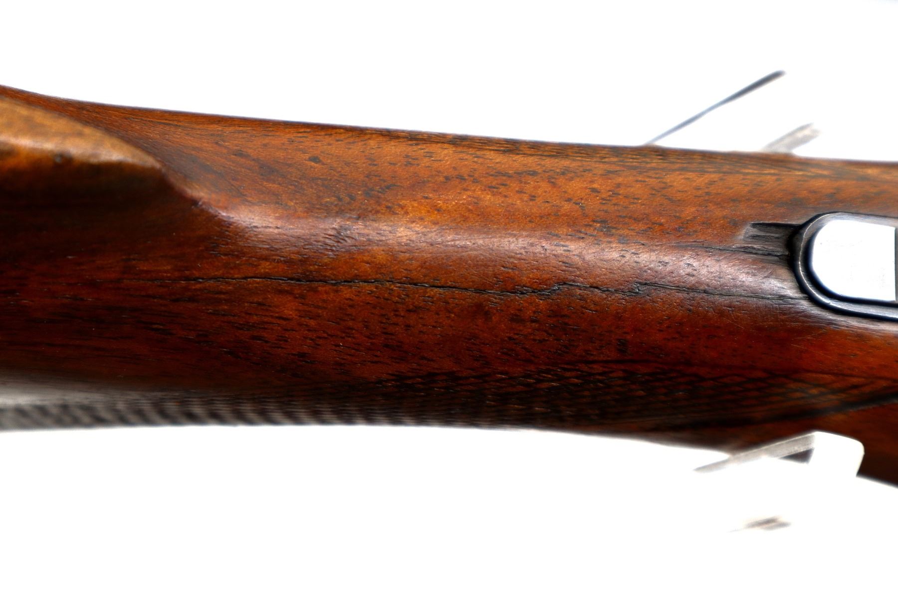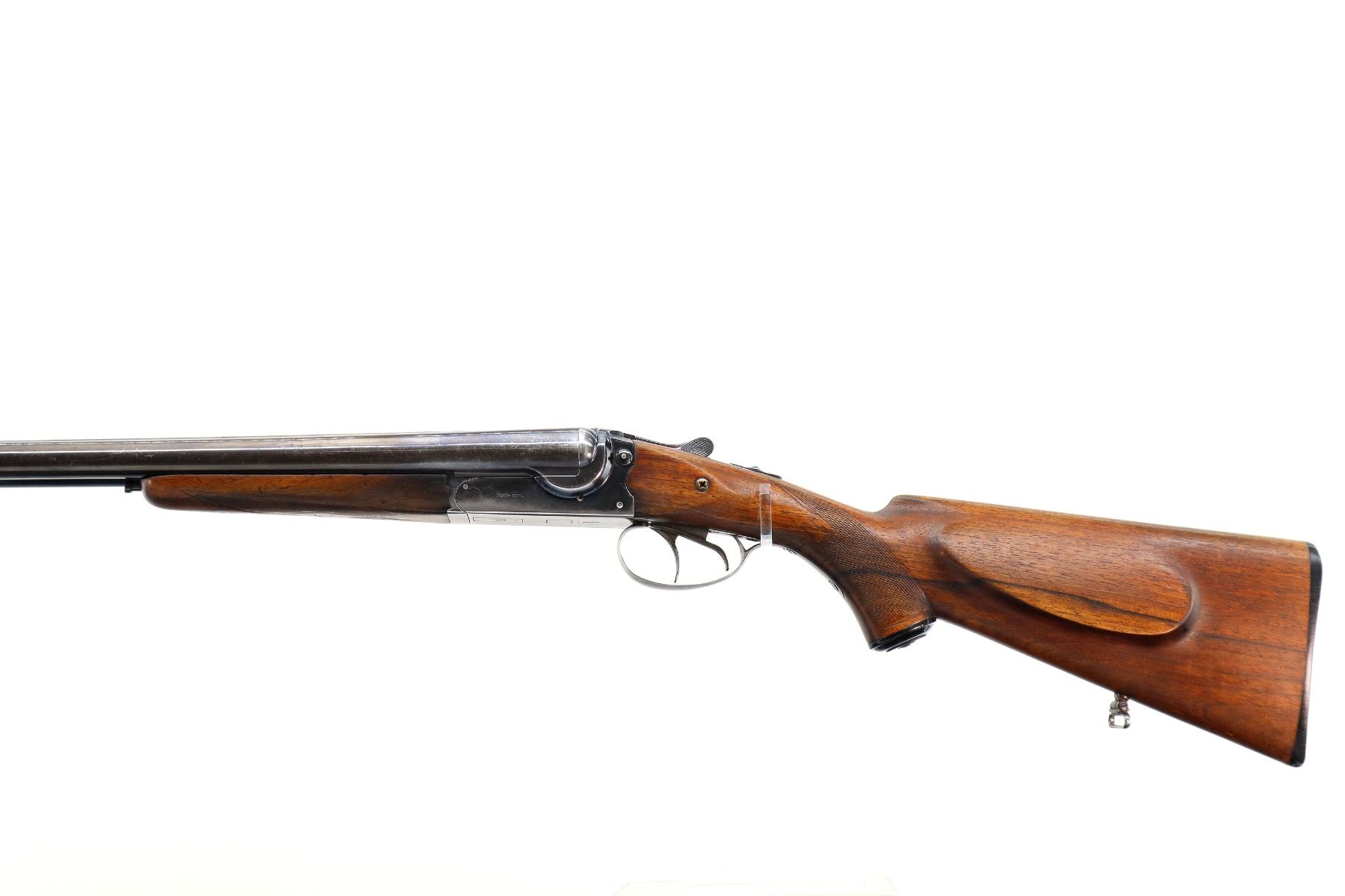 Main Description: Silver bead, blued finish, solid rib, automatic safety, extractors, cocking indicators, double triggers. Two piece wood stocks, checkered forearm and pistol grip, chipped cracked and repaired behind receiver and tang, European cheek rest, grooved black polymer butt plate chipped at toe, grip cap and sling swivels.