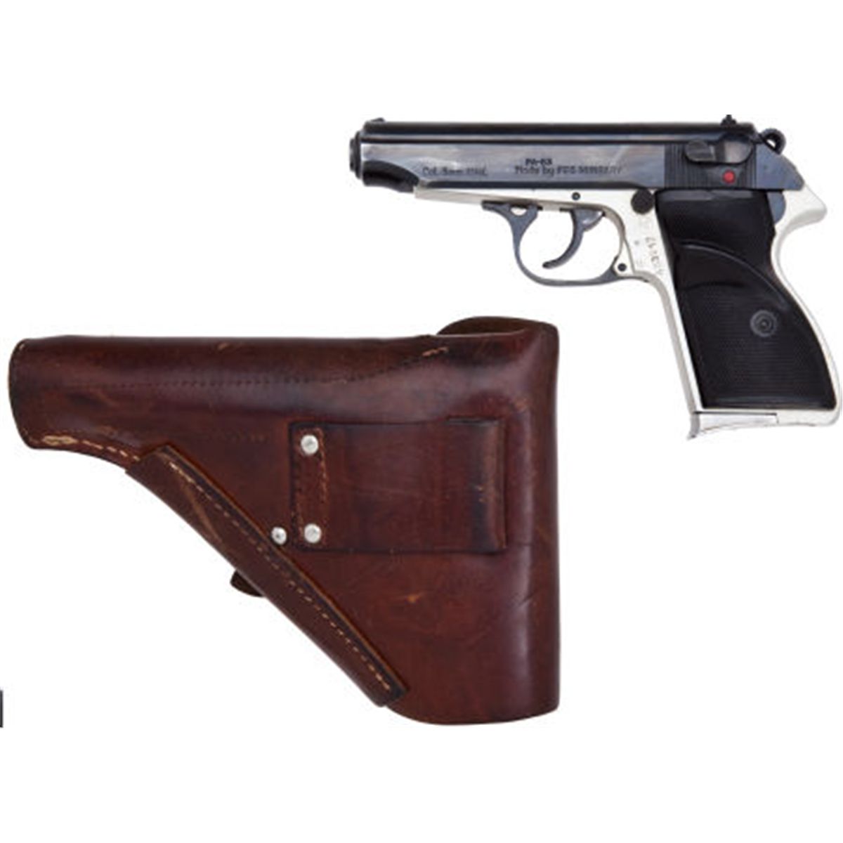 FEG PA-63 Semi-Automatic Pistol with Vintage Holster. Serial No. AB3817, 9mm, 4-inch barrel. Blued and brushed aluminum finish. Importer's stamp on right side of slide. Black plastic grips. Sold together with extra magazine and unmarked, fine brown military flap holster. Both magazines are numbered to the gun.Condition: Good. Retaining approximately 90-95% original finish with scattered dents, scratches and light handling wear. Strong bore with light wear. Holster is very good. Soft, supple leather with age wear and patina.NRA FIREARMS FOR FREEDOM PROGRAM