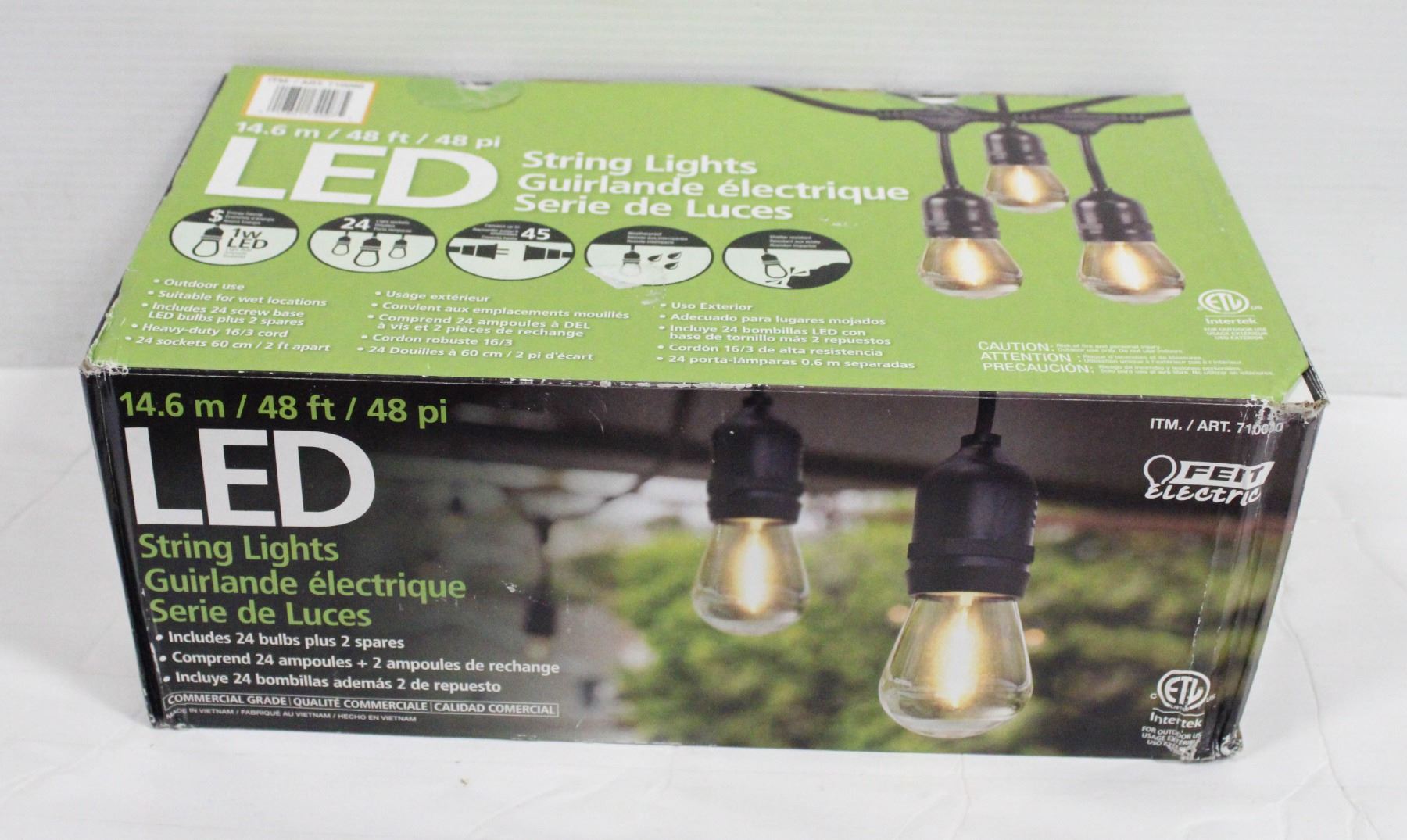 FOR INDOOR OR OUTDOOR USE, SUITABLE FOR WET LOCATIONS, DECORATIVE FILAMENT LED BULBS 2200K SHATTER RESISTANT BULBS, HEAVY-DUTY 16/3 CORD 24 SOCKETS 2FT APART 1 WATT LED BULBS **ALL ITEMS MUST BE REMOVED BY 5PM SATURDAY, JULY 15TH 2023. ALL REMAINING ITEMS WILL BE SUBJECT TO A $6.00 PER DAY STORAGE CHARGE. ANY ITEMS REMAINING AFTER MONDAY, JULY 31ST, 2023 WILL BE CONSIDERED FORFEITED. NO REFUNDS WILL BE ISSUED FOR FORFEITED ITEMS. TO SCHEDULE A PICK UP APPOINTMENT CLICK HERE
