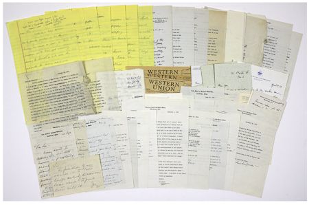 (1882-1965) Supreme Court Associate Justice, founder of the A.C.L.U. and a leading exponent of judicial self-restraint. A fine archive of correspondence between Frankfurter and JOSEPH HALL SCHAFFNER. Schaffner (1897-1972) became director of the clothing manufacturing firm Hart, Schaffner and Marx in 1922, and served with Frankfurter on the Council on Foreign Relations (CFR), possibly from 1950 onward. The CFR was founded in 1921 with the mission to "better understand the world and the foreign policy choices facing the United States and other countries", is widely considered the most influential think tank and counted among its founding members Herbert Hoover and contemporary dignitaries such as Madeleine Albright and Tom Brokaw. This archive comprises 29 letters of Frankfurter penned to Shaffner from 1927-1964 (12 A.L.S. and 17 T.L.S.); four A.L.S. of Shaffner to Frankfurther 1937-1959; five letters of MARION FRANKFURTER, Frankfurter's wife; and additional letters from Frankfurter's secretary, a few telegrams and letters from unknown correspondents. The letters between Frankfurter and Shaffner reflect their lifelong camaraderie and intellectual acuity, with Frankfurter's largely penned on his Harvard University letterhead and later, Supreme Court letterhead, signed with initials "F. F. ". A few of the letters comprise annotations at the conclusion of letters to him as well. No subject too trivial escapes Frankfurter's gift for erudition and eloquence, making the most mundane topics a pleasure to read; more importantly are his elegant reflections on literature, law and life. In very small part: "...[March 9, 1936] You are as much an old foegy [sic] as I am intimating that secretaries are, like automobiles and telephones, doubtful manifestations of 'progress'. The better they are, the worse for one's character - and still worse for one's ability to find one's way through old files...[May 27, 1937] I have written to Swope [Herbert Bayer Swope, influential journalist, editor and recipient of the Nobel Prize in Reporting] with all the seductiveness that I can command, and we shall see what we shall see...I shall now see what I can do with Elizabeth Ellis [wife of socialite yachtsman Ralph Ellis, a lifelong friend of Frankfurter]...[June 19, 1937] Why didn't I propose something worthy of your talents? For long I have wanted the original pencil draft of the Justinian Code, Plato's notes on Socrates' lectures; for long have I wanted to know the undoubted authorship of the Letters of Junius, and the unquestionable subject of Shakespeare's sonnets. These, just by way of a starter, are some of the commissions I should have given you instead of asking you to turn a simple little Hungarian handspring. Anyhow, the cunning bottles have arrived with their cunning contents. And we shall be drinking your good health...and I hope not always soberly...[June 11, 1937 I sent an inadequate word of thanks...for the Zwachi...They have a quaint custom...in Hungary called Radosh. When you buy a pound of something they throw in something more for good measure...You cleared up a little mystery. A boy who delivered the package said it was from Mr. Shaffner, and just for a moment I was surprised, but then reflected on the pervasiveness of your friendships. But now you can tell me I am the beneficiary of your sinister purpose. So be it. I can stand it if you can...[Aug. 5, 1937] I am glad to see this circular of Weigel's. I am not surprised that the esprit de corps of his staff is what I believe it to be. You certainly gave him some sound advice...I am afraid I hardly conveyed to you the intensity of my interest in the problem which you brought me, and my eagerness to hear of future developments...A damned good time was had by both Marion and me. She paid Jack Viner [Jacob Viner, American economist considered the greatest of his time] a compliment I had rather honestly earn than any other in the world. 'What a thoroughly honest-minded person he is', was her first comment...Talk with him is exhilarating, isn't it?... [Oct. 9, 1937] I have already written Hiram Halle [American businessman who was dedicated to Jewish causes during WWII] how terribly sorry I am that we can't go to his party...[Dec. 17, 1940] How thoughtful of you to write me about the authorship of 'Guilty Men' [a controversial work published in Britain in 1940 under the nom de plume Cato, attacking prominent public figures for their policy toward Nazi Germany]... [Feb. 1, 1949] You are very kind to ask me to do the Herman Vale and of course I would like to do so very much. But with characteristic perception your realize that between what I like to do and what I am able to do these days there is an awful gulf. This office [as Supreme Court Justice] necessarily cramps me in being to say what I want to say because there is hardly an issue of importance as to which utterance by me might not later plague me when it may form some aspect of a future litigation. I would take that chance in the case of Herman but I simply have not the time...I would have to soak myself in order to refresh my knowledge...[Feb. 26, 1941] I am perfectly delighted that Max Radin [notable author and professor of law] is taking on the job....That is a happy picture you painted of Perugina. I have known few fathers who would have had such detached and yet such devoted delight...But then tragedy is at the core of life and courage in meeting it is life's most manly demand..., and more. Shaffner's letters contain equally compelling content, one in particular comprising an 11pp. A. L. (unsigned) to Frankfurter, Apr. 11, 1959, to Frankfurter lauding his speech on his friend, the influential jurist Learned Hand. In small part: "...Rarely in a man's lifetime does he have the privilege in six days of hearing one speech as great as Carl Sandburg's at the twenty-fifth anniversary dinner of the University in Exile, and then read another this morning such as yours made yesterday for Learned Hand. I 