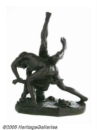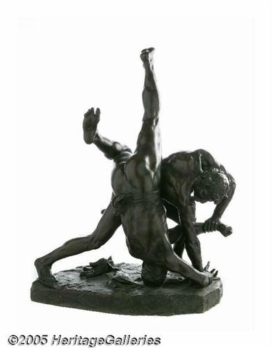 <B>FELIX MAURICE CHARPENTIER (French 1858- 1924)</B></I><BR>Two Wrestlers<BR>Bronze<BR>26in. tall<BR>Signed in cast<BR>Foundry mark: Jollet et Colin Paris<BR><BR>Condition Report: Overall very good condition<BR>