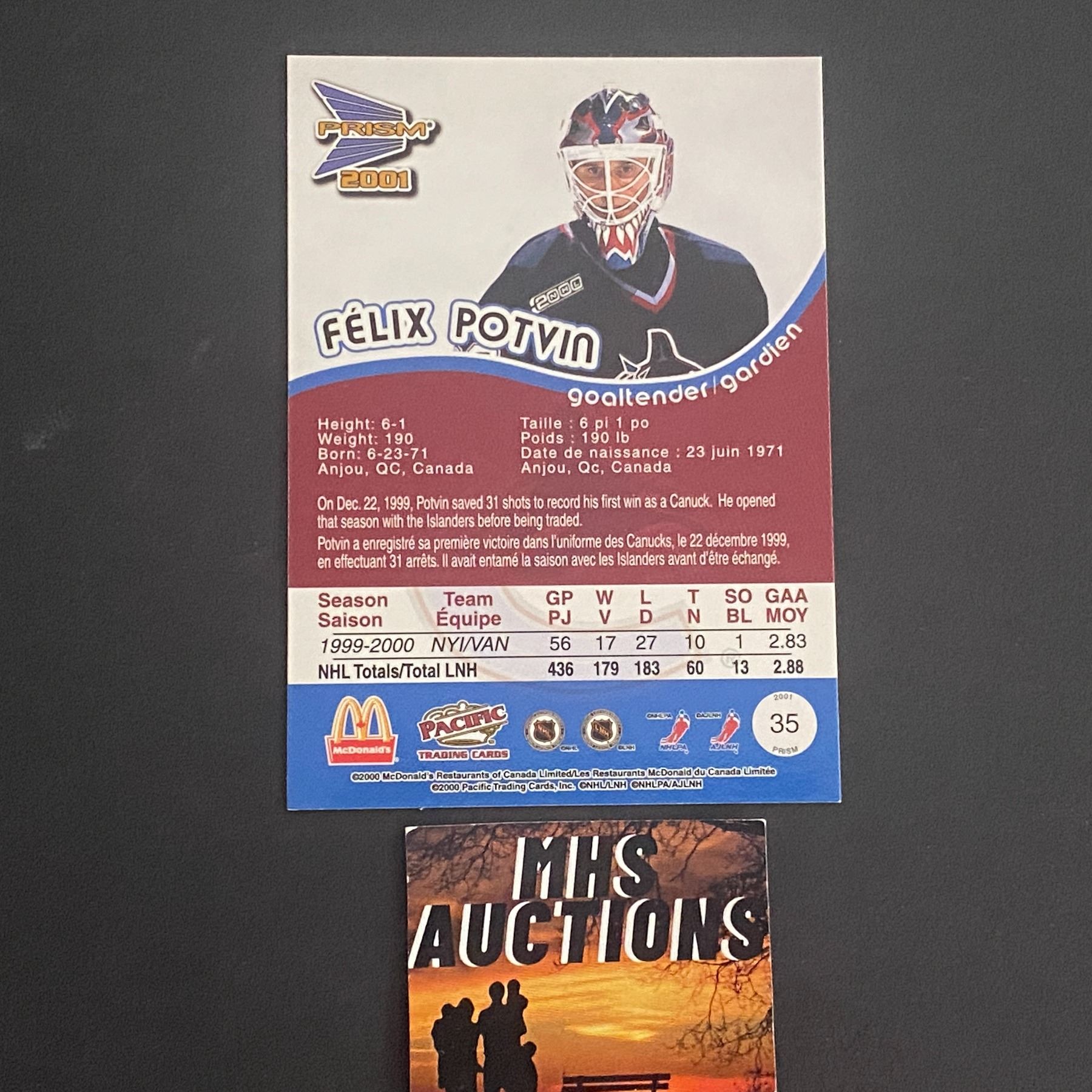 FELIX POTVIN 2001 MCDONALDS BLUE RARE HOCKEY CARD