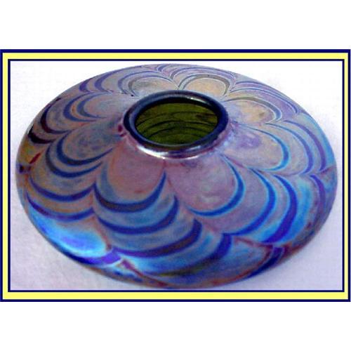 Steve Fellerman vase in iridescent glass. Circa 1977.<BR>Measures 1inch in height and 5 1/4inches accross.<BR>Amber glass with an iridescent gold drag loop pattern. Colours change from gold to purple through every shade of blue, quite magical in effect. Underneath is in clear amber with silver feathers.<BR>Etched signature FELLERMAN 77.<BR>Mint condition.<BR>Fellow ebayers have mentioned that Fellerman's works are on display at the White House and part of Queen Beatrice of the Neatherlands private collection, and his works have received numerous awards.