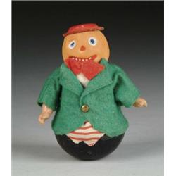 FELT DRESSED PUMPKIN ROLY-POLY. A charming Halloween roly-poly, with felt and cotton clothing and a red cap. SIZE: 4 1/2” t. CONDITION: Very good. JL 1-3735 (500-700)