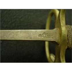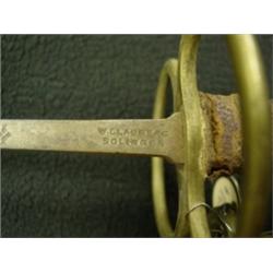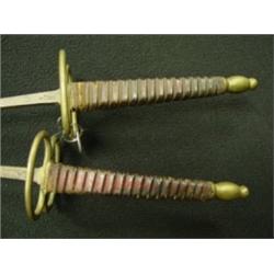Fencing Swords by W Clauberg. 40" long. Brass with wrapped leather handles. Tips are also leather wrapped. Shaft bears "standing knight", symbol of Clauberg, well-known 19th Century maker. Also marked "W. Clauberg Solinger" and "Boling". Condition: Very Good