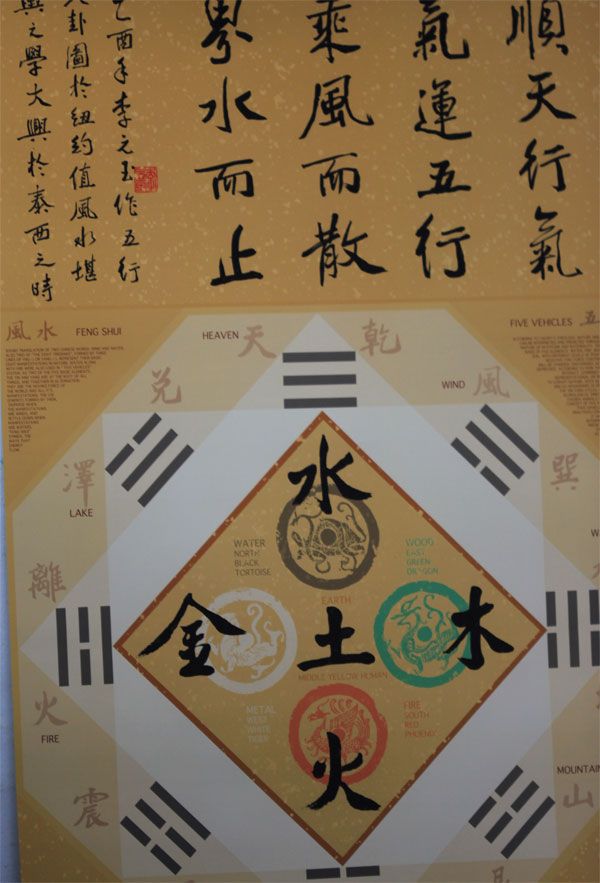 FENG SHUI CHART **|**|** 24X36INCHES; UNFRAMED; This poster shows a chart of Feng Shui elements. In the center are the major elements: water, wood, fire, earth, and metal. Surrounding these are more elements: wind, water, mountain, earth, thunder, fire, lake, and heaven. Feng shui is an ancient Chinese system of aesthetics believed to use the laws of both Heaven (astronomy) and Earth (geography) to help one improve life by receiving positive qi. The term feng shui literally translates as 'wind-water' in English. Historically, feng shui was widely used to orient buildings ; MSRP: $1500