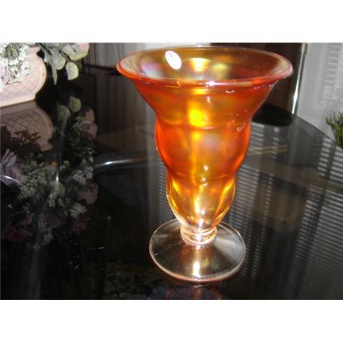 THIS AND ODD COLOR AND DESIGN FROM FENTON. THERE IS FACTORY MISTAKE ON THE RIM OF THE VASE.IT IS A SIGNED VASE 100 YEARS ON BOTTOM. THIS WILL BE A HARD TO FIND COLLECTIBLE DUE THE UNUSAL COLOR AND DESIGN FROM FENTON. IT IS 9 IN TALL AND AN ORANGE CARNIVAL COLOR.