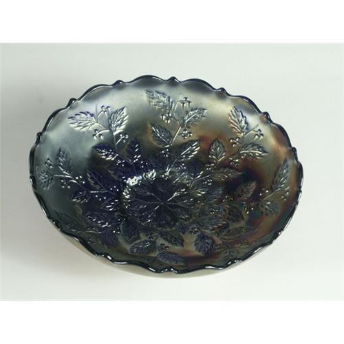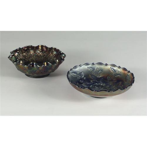 Two amethyst carnival glass bowls. The first is Fenton, marked on underside and original sticker on inside, Persian Medallion pattern, 7'' x 2.75''. The second is a black amethyst holly bowl, which is the rarest color in this pattern, produced by Fenton, Dugan, and Northwood, unmarked, 8.25'' x 2''.