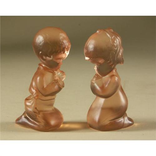 FENTON ART GLASS FIGURINES: Fenton art pink glass figurines of a boy and a girl praying. Measures approximately 4''H. Original sticker on bottom of boy.