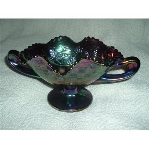 A BEAUTIFUL BASKET WEAVE/FRUIT DESIGN AMETHYST CANDY DISH. AN ENLONGATED DESIGN WITH HANDLES ON A WIDE BASE PEDESTAL. IT IS MARKED FENTON ON THE BOTTOM.