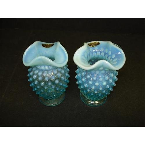 BEAUTIFUL PAIR OF FENTON OPALESCENT BLUE HOBNAIL PAIR OF VASES, THESE ARE ORIGINAL WITH ORIGINAL STICKERS ON EACH:"HAND MADE IN AMERICA by FENTON" Excellent condition,Each stands about 4 inch high, US Buyer to pay 9.00 for shipping plus insurance.THANKS.