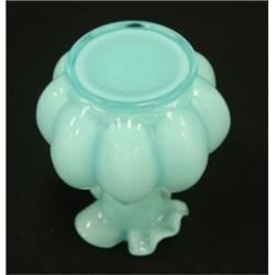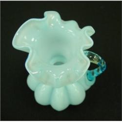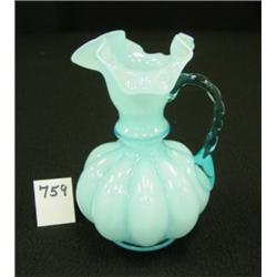 FENTON Blue Overlay handled jug. Clear blue handle and ruffled rim. No. 192. Circa 1943. 6" tall. Condition: Excellent