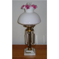 14" base with 10" glass chimney 9" by 9 1/2" diameter glass shade, Fenton brass lamp with prisms, peach crest shade, marble base. Brass base has 8-6 1/2" glass prisms. Excellent condition.