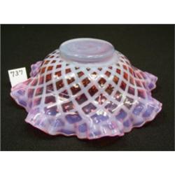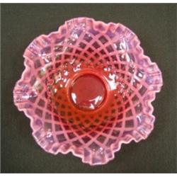 FENTON Cranberry Opalescent 10" bowl. Diamond optic. Crimped, ruffled edge. 3.5" tall. Marked "Fenton" in oval under base. Condition: Excellent