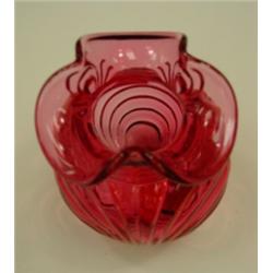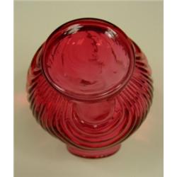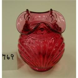 FENTON Cranberry Shell vase. Crimped rim, bulbous shape. Marked on bottom. 4.75" tall. Condition: Excellent