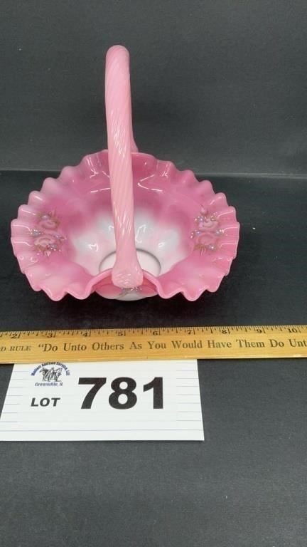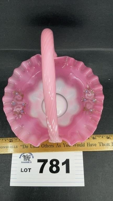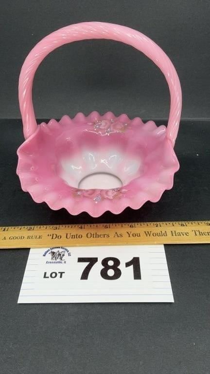 FENTON GLASS HAND PAINTED BASKET, 7 INCHES TALL