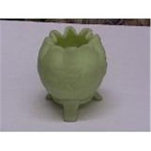 THIS IS A BEAUTIFUL THREE FEETED VASE WITH THREE RAISED MOTIF OF GRAPES AND LEAVES- RAISED DIAMONDS AROUND THE MOTIVES AND RUFFLED TOP.