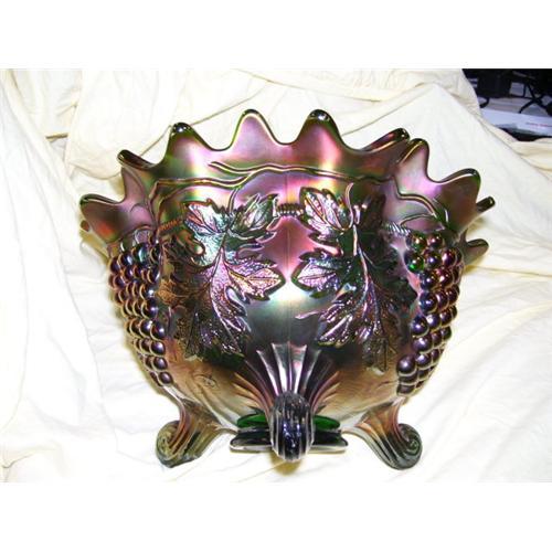 THIS IS A RARE FENTON CENTER PIECE BOWL. EXTERIOR PATTERN IS GRAPE & CABLE, AND INTERIOR IS RARE PERSION MEDALLION. GREEN 3 FOOTED. THIS HAS A SLITHER ON ONE OF THE TOP TOOTHES. IT HAS A STRAW MARK ON THE BOTTOM. I HAVE INCLUDED PICTURE OF SLITHER.