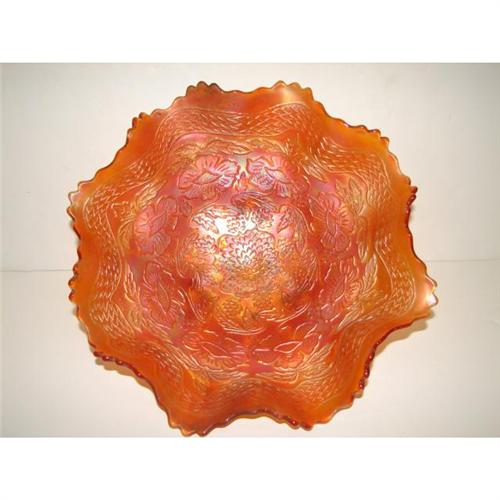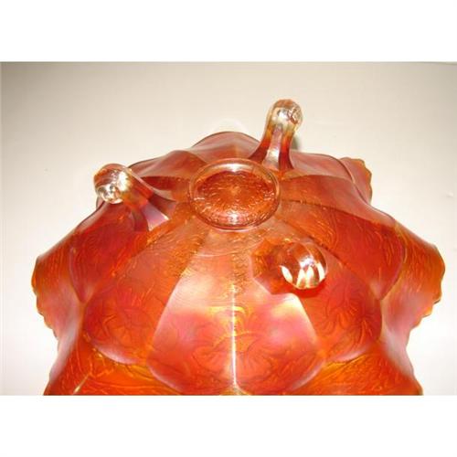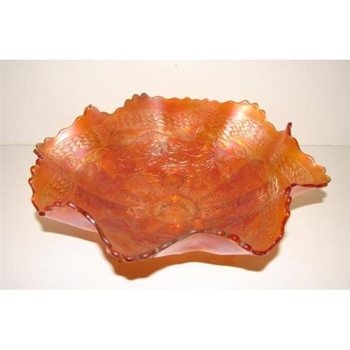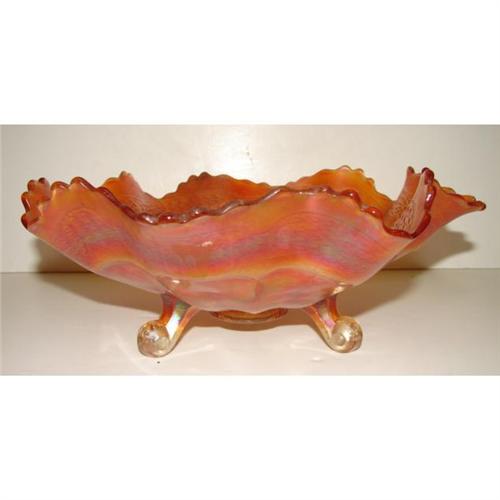 FENTON MARIGOLD CARNIVAL GLASS BOWL. Two Flowers pattern. Bowl has fluted top and rests on three feet. 4” H, 10.5” Dia.